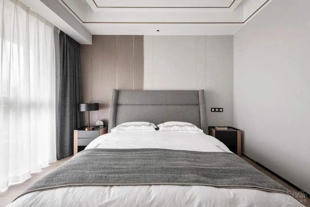 茶灰作为主卧空间主色调谦逊优雅,营造出舒适的睡眠氛围。木质、金属、棉麻的材质混搭,在实用与美观中找到了完美平衡。