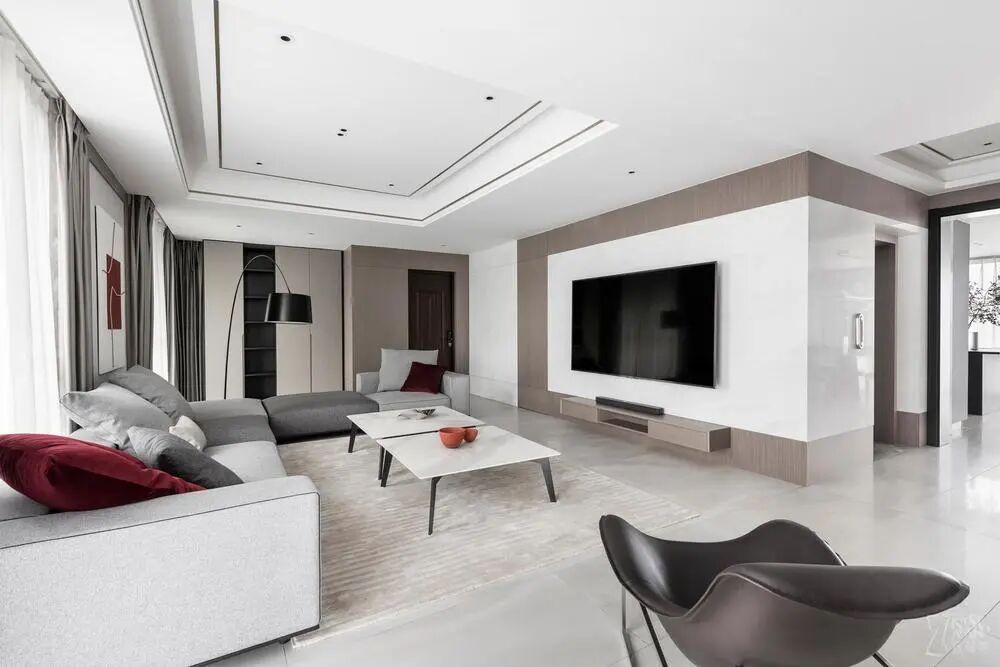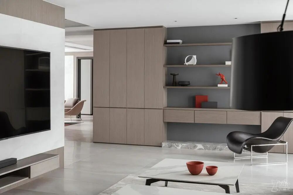 另一客厅空间则以沙茶色为主基调,大面积定制柜和墙面则选用茶色及暖灰使色调整体变浅。