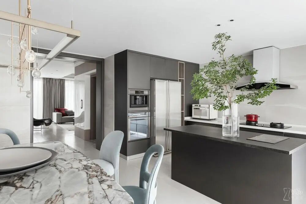 设计师将厨房与用餐区整体划分到一个区域除了方便清理外,从烹饪就餐的洄游动线考虑也更加便利。餐桌与岛台对面相望,互动式开放设计更能拉近了彼此的距离。