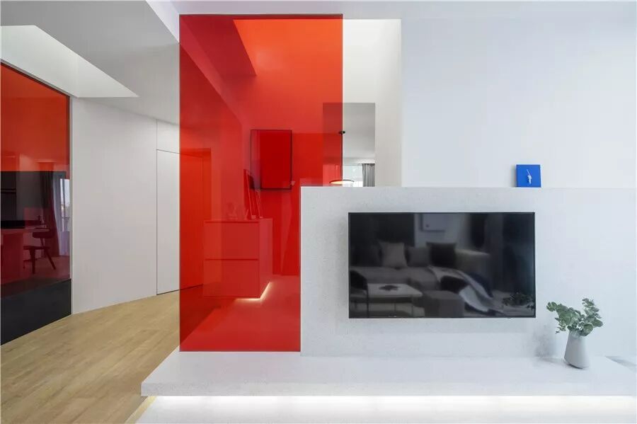 半开放式的电视墙有利于空间的通透性,下方的镂空玻璃橱窗是设计亮点之一。