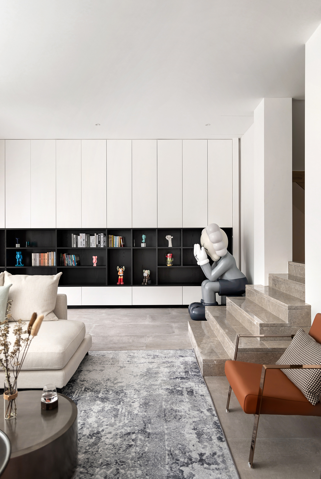 如果担心没有吊顶会很单调,可以在墙顶做一些点线的挖空设计,层次感更强。