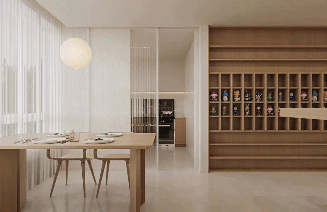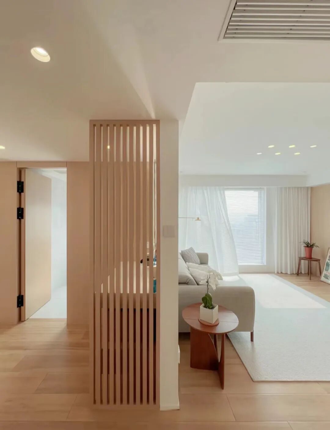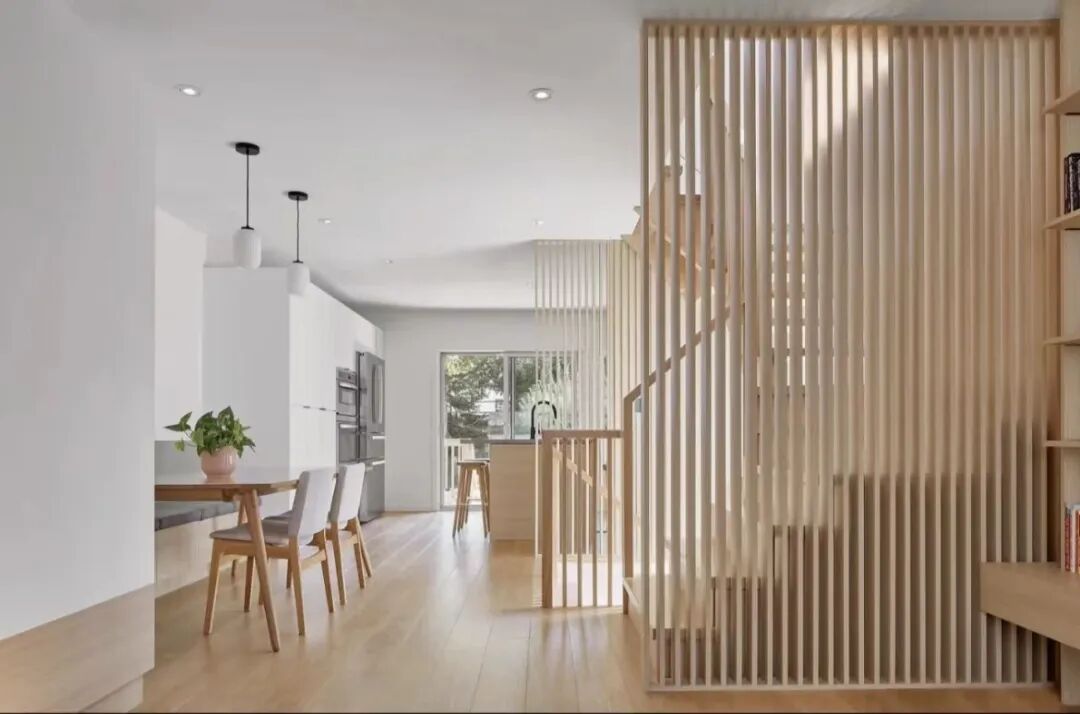 格栅隔断不像整面墙体那样将空间完全隔开,而是在隔中有连接,断中有连续,同时又能有效的进行空间分割,装饰性更强。与简约风结合更能增强线条感和流畅感。