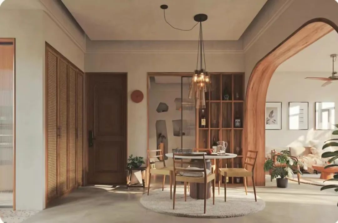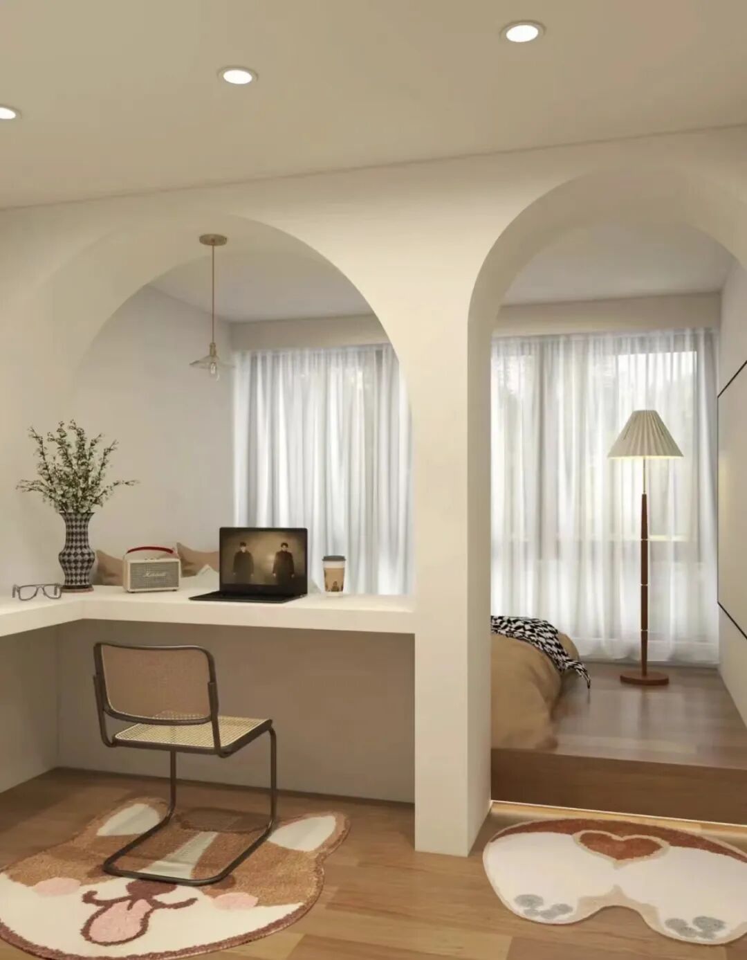 很多小户型完全封闭的设计会使空间过于逼冗,拱形门可以很好的消除空间的死板,凹墙也可以起到遮挡作用。人少可以不用做门,装个帘子遮光即可。