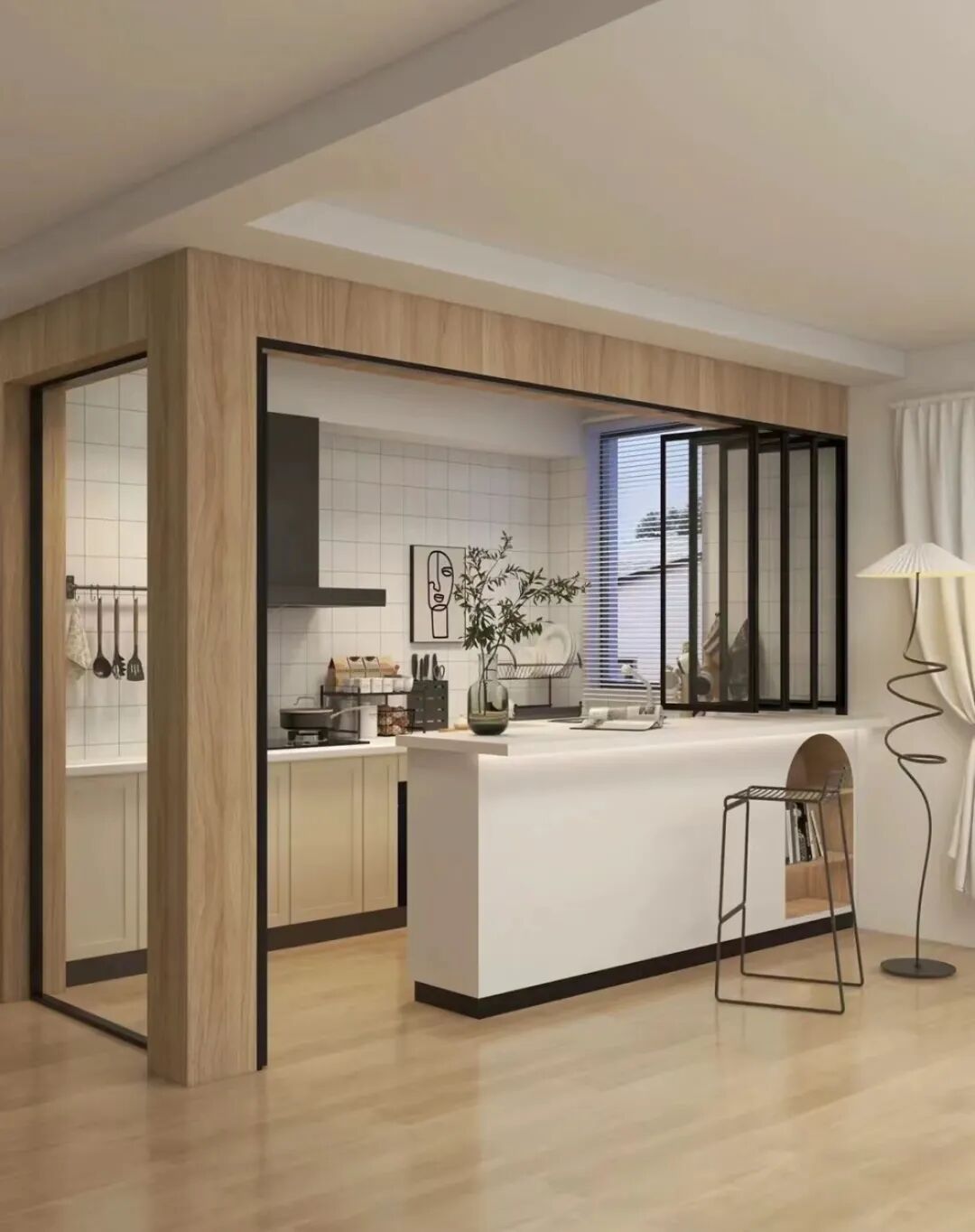 半墙隔断打造出半开放式的厨房,特别适合小户型或是采光不佳的厨房。保持视线的开阔,做饭的同时还能与家人之间交流沟通,消减备餐过程中的单调与乏味,增强家庭的温馨氛围。