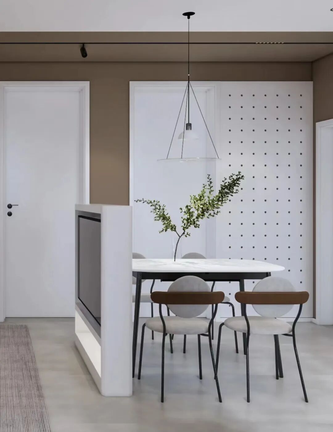 在客餐厅空间中不装门,用上拱形门元素,营造开放又别具一格的空间,透过门洞,还能放大空间观感。设计作为一种软性干预,不会对空间造成太大影响或破坏,将两个空间打开,同时保持各自的边界。