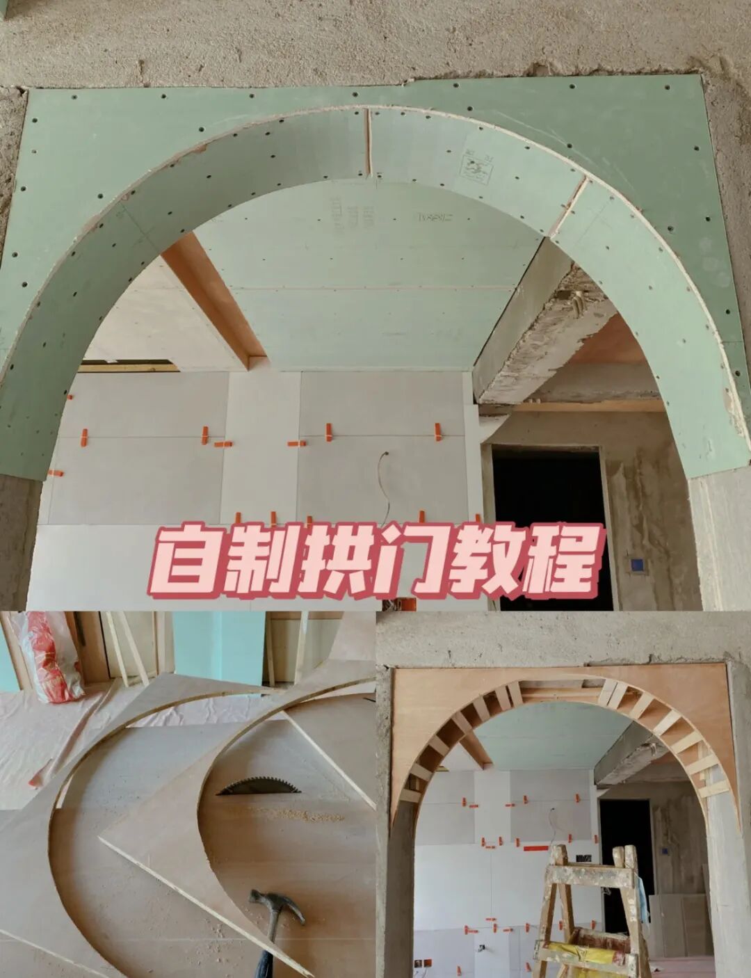 2、确定拱的弧度与尺寸。在细木工板上描绘再切割出弧形,确定拱形门的具体弧度和尺度,在细木工板上先勾勒出来,在此基础上进行切割。