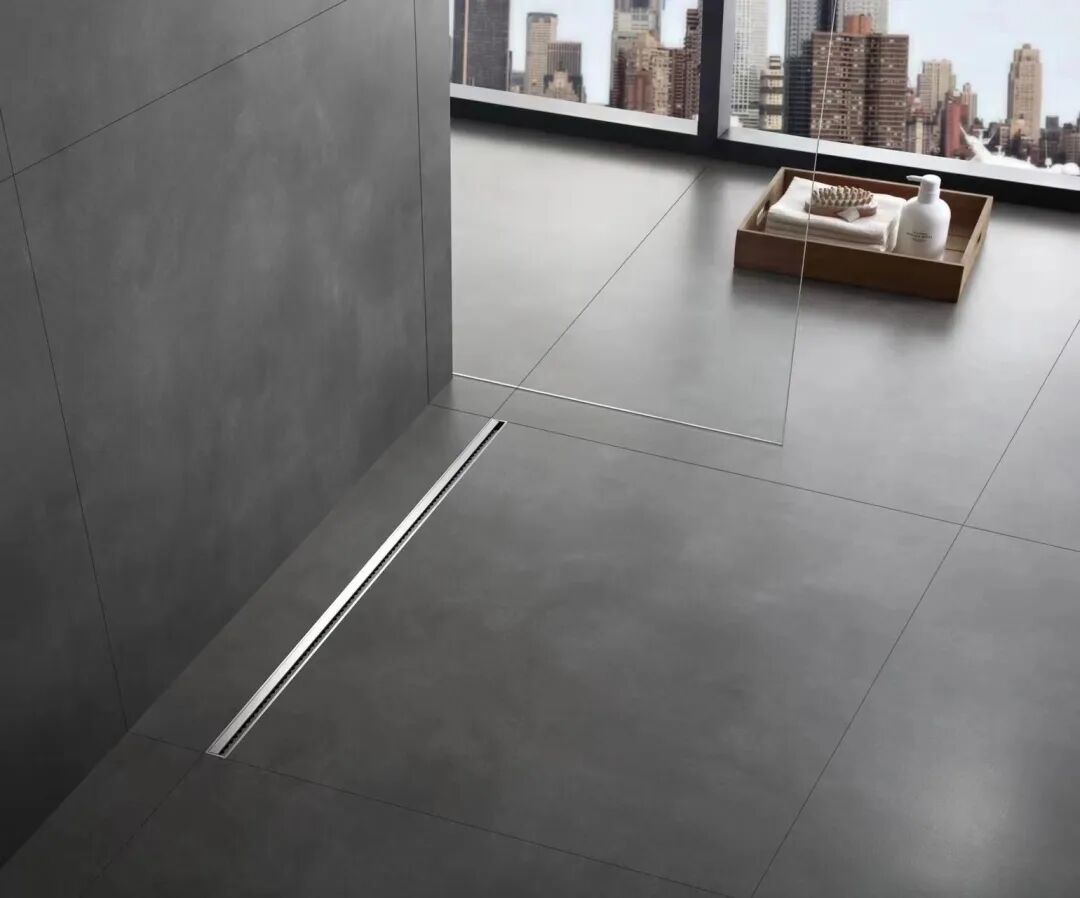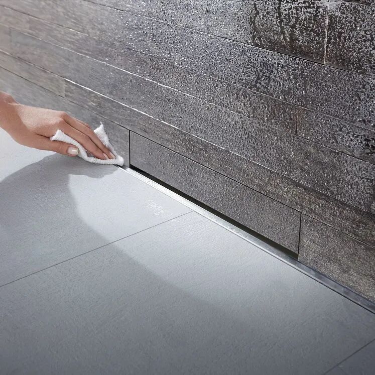 断水槽式地漏较普通的条形地漏更长,安装在卫生间干湿分离交接处,不但有地漏功能,而且可以阻断地面流水,达到干湿分离效果,比挡水条强多了,还可以围绕玻璃淋浴房做一圈,干湿分离效果更好。