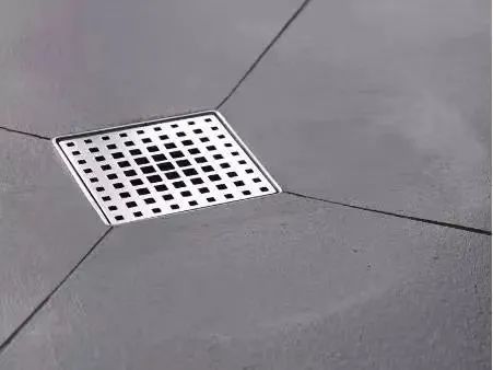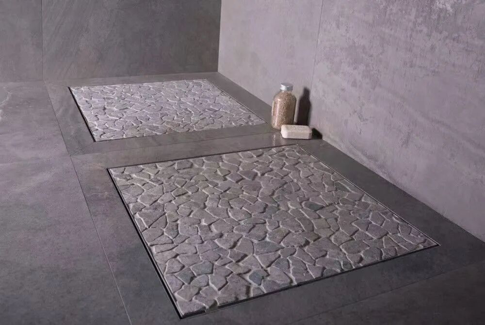 隐形地漏有各种形状,和普通地漏唯一的区别在于可以内嵌瓷砖。一般隐形地漏的盖板是正反两用的,正面就是普通的金属实心盖板,比较有科技感;将盖板翻过来可以嵌入相应尺寸大小的瓷砖,与卫生间地面保持一致,达到隐形效果。
