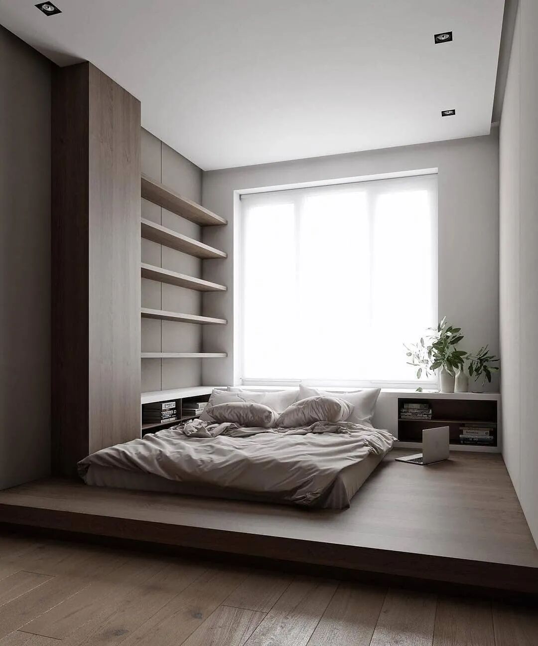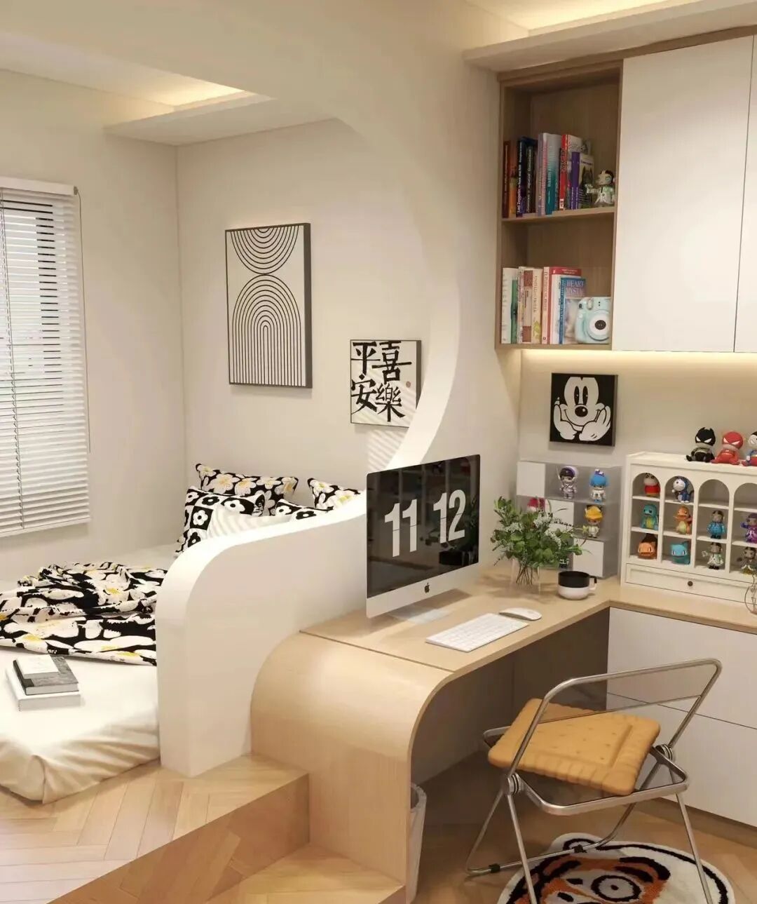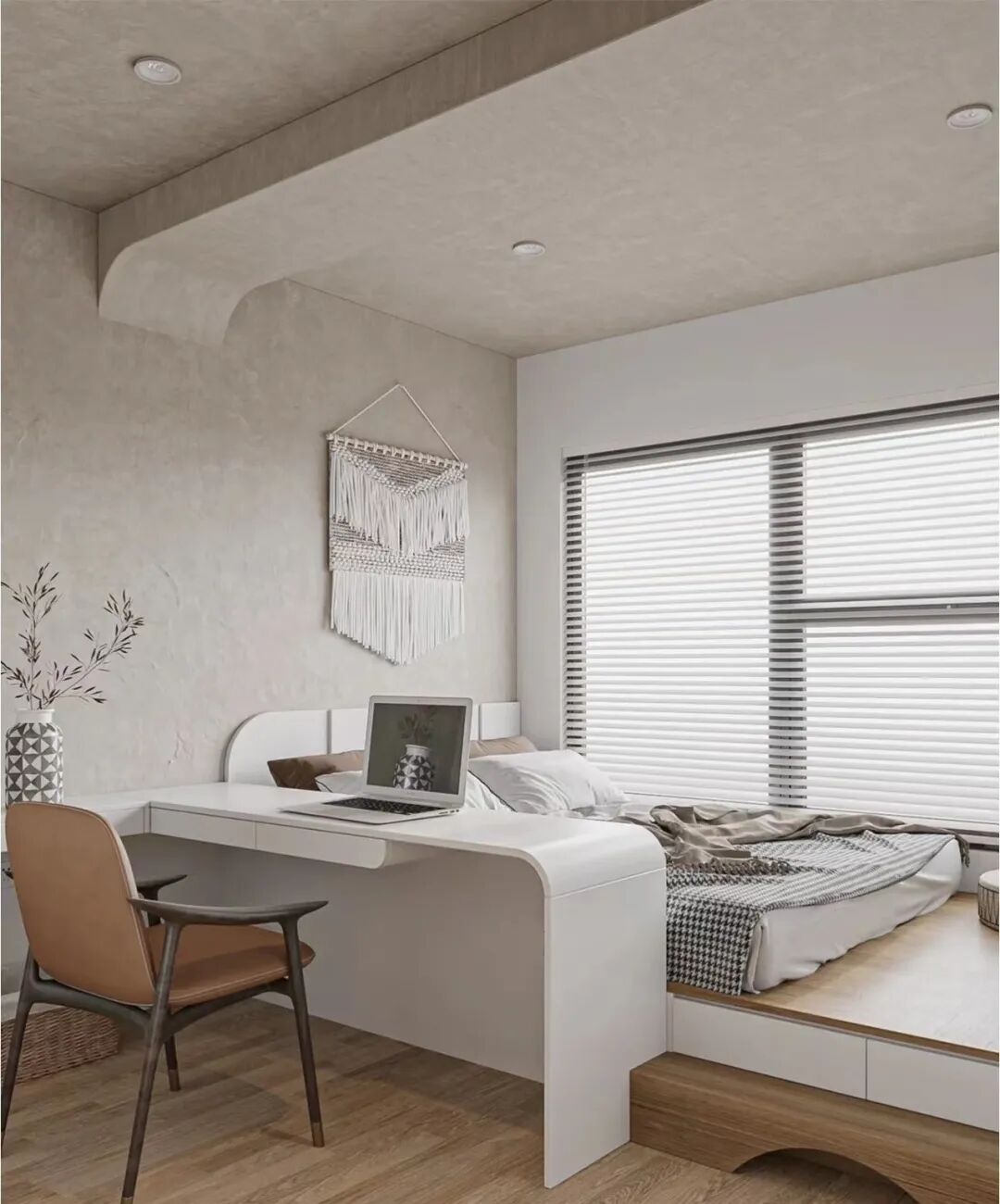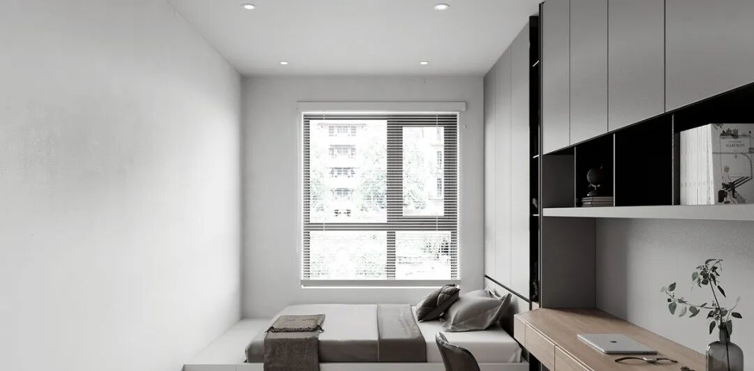 卧室太小,不住人又感觉有些浪费,光住人又觉得几万一平不划算,其实我们考虑台阶式榻榻米床,高度一般在450~600mm左右,底部可以考虑侧面收纳,如果觉得床底收纳不方便,也考虑底部留空,床头或者床尾做一体定制柜,L型书桌最大化的利用空间,无论是办公还是充当衣帽间都是不错的选择。