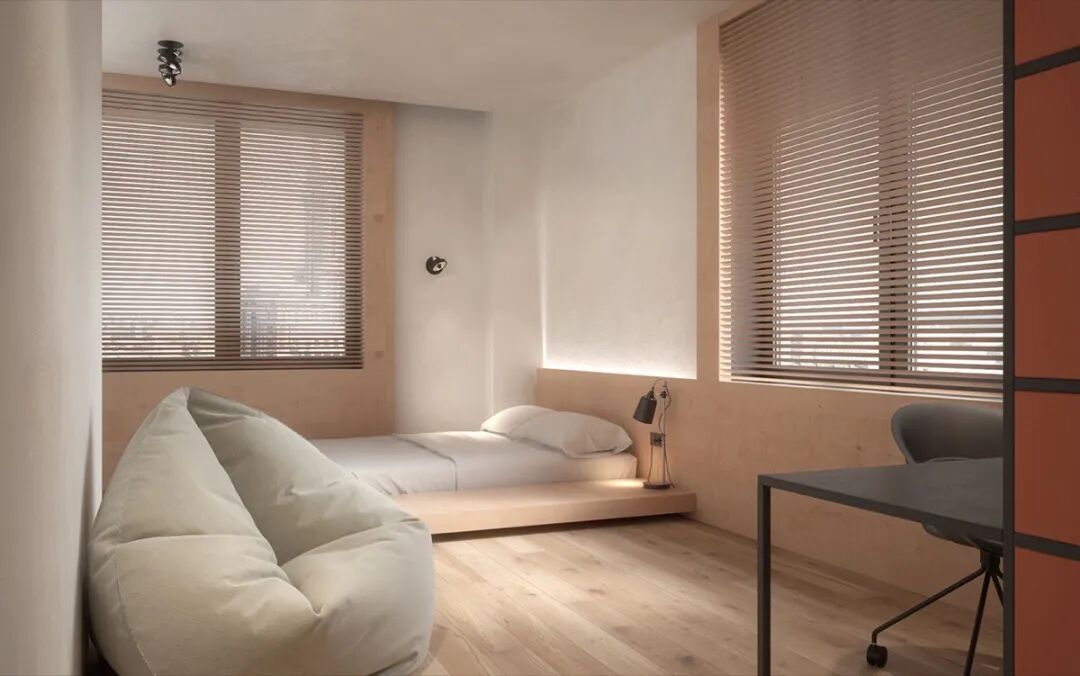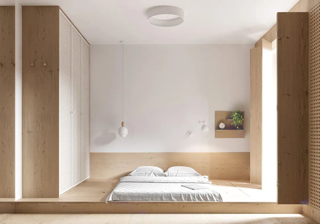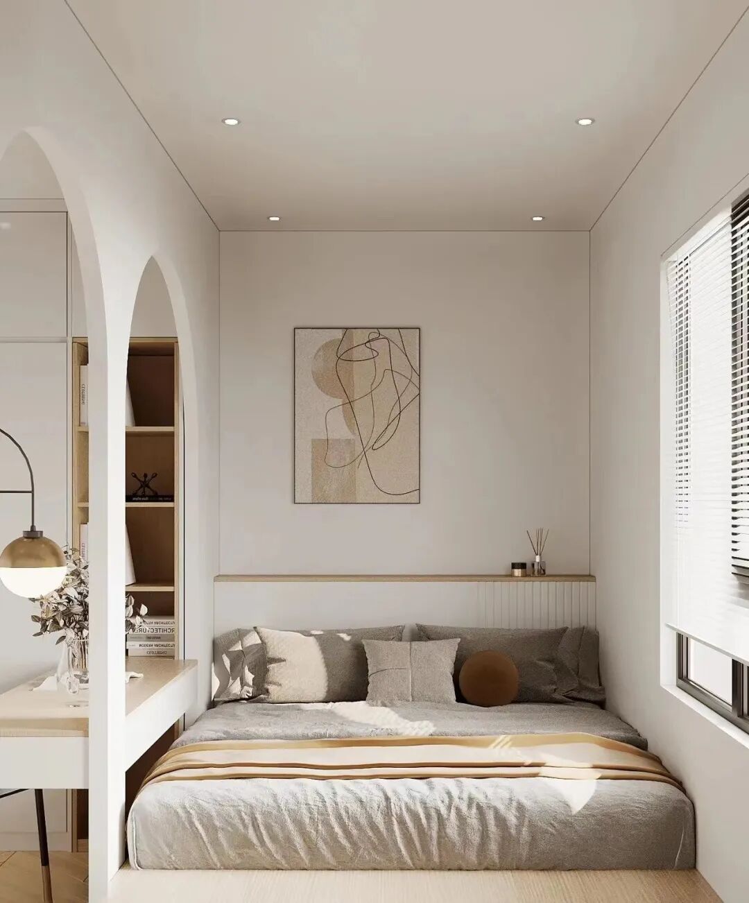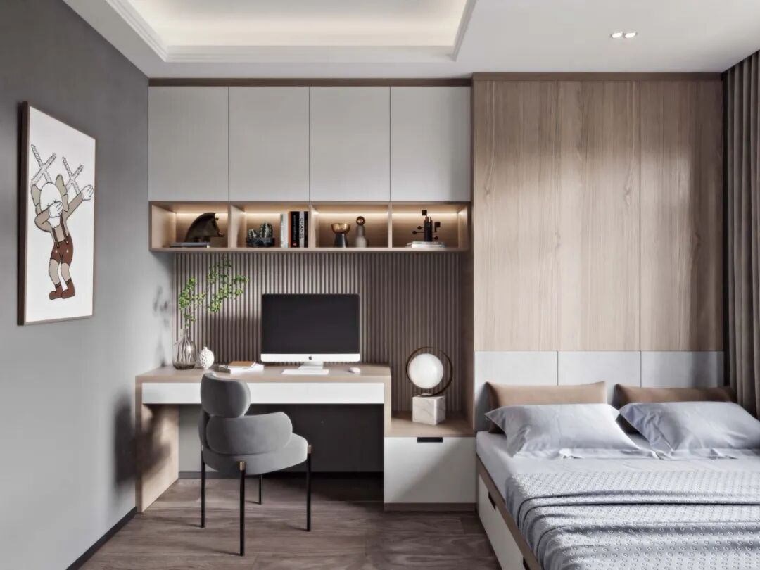 卧室太小,不住人又感觉有些浪费,光住人又觉得几万一平不划算,其实我们考虑台阶式榻榻米床,高度一般在450~600mm左右,底部可以考虑侧面收纳,如果觉得床底收纳不方便,也考虑底部留空,床头或者床尾做一体定制柜,L型书桌最大化的利用空间,无论是办公还是充当衣帽间都是不错的选择。