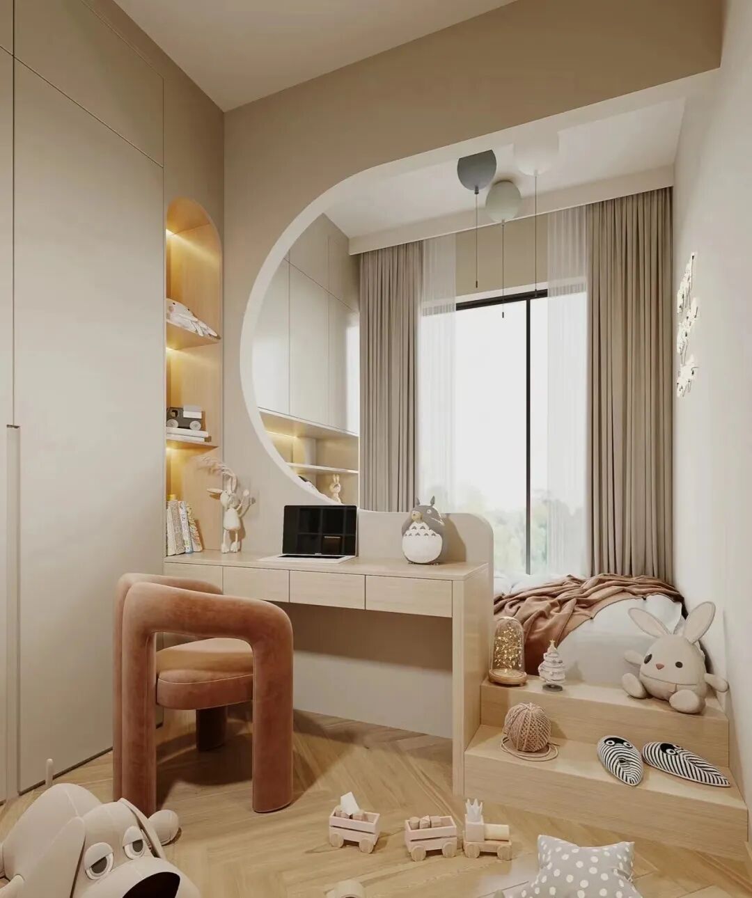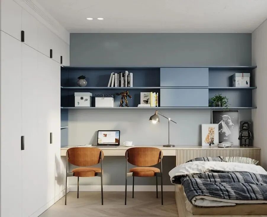 如果觉得床头有吊柜影响睡眠,可以将床头做弧形床头板+挂画装饰,一旁设置书桌也可以代替床头柜,隔板收纳既好看又实用。
