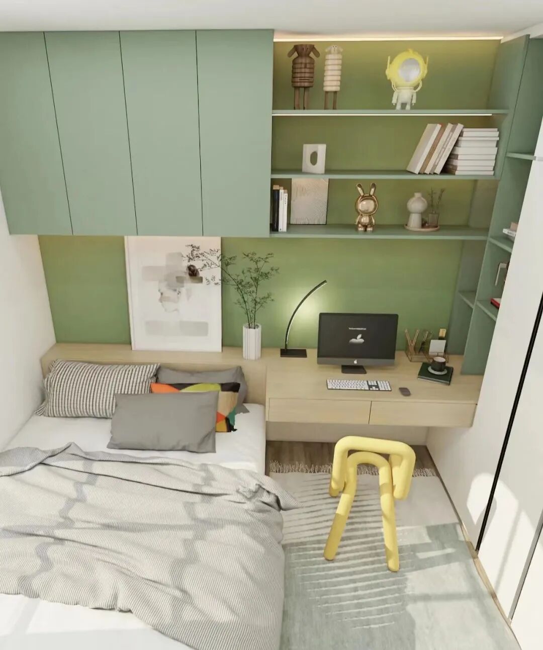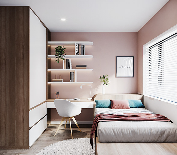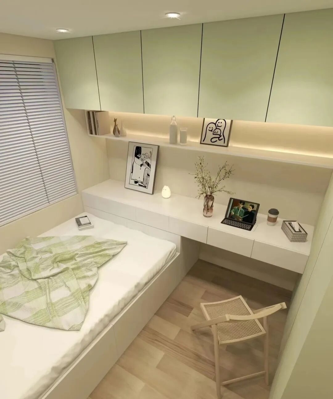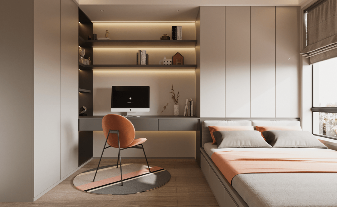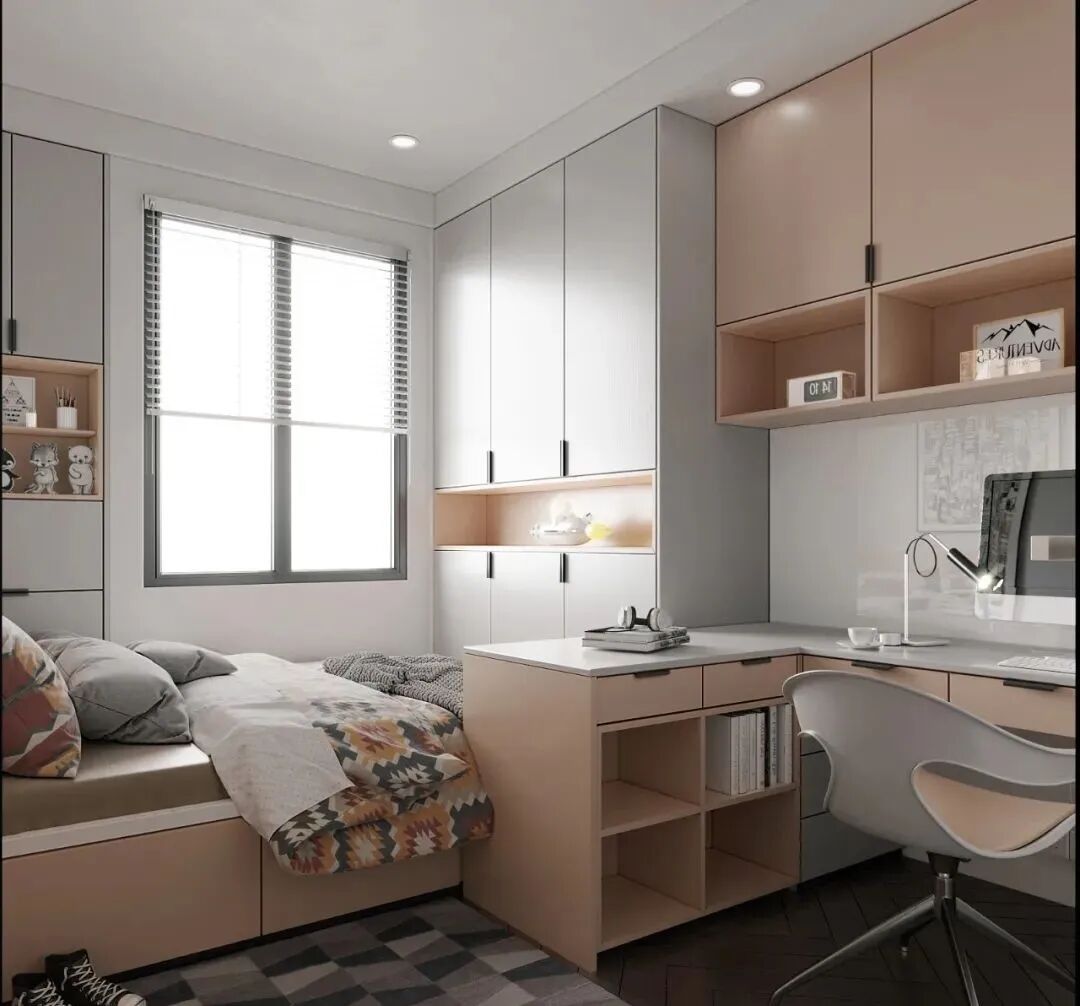 为了让空间不显压抑,床头可以做吊柜,靠床的收纳地柜延伸出来与书桌一体,将收纳空间增加到最大化的同时,也能满足女生化妆打扮的需求,还能代替床头柜使用。