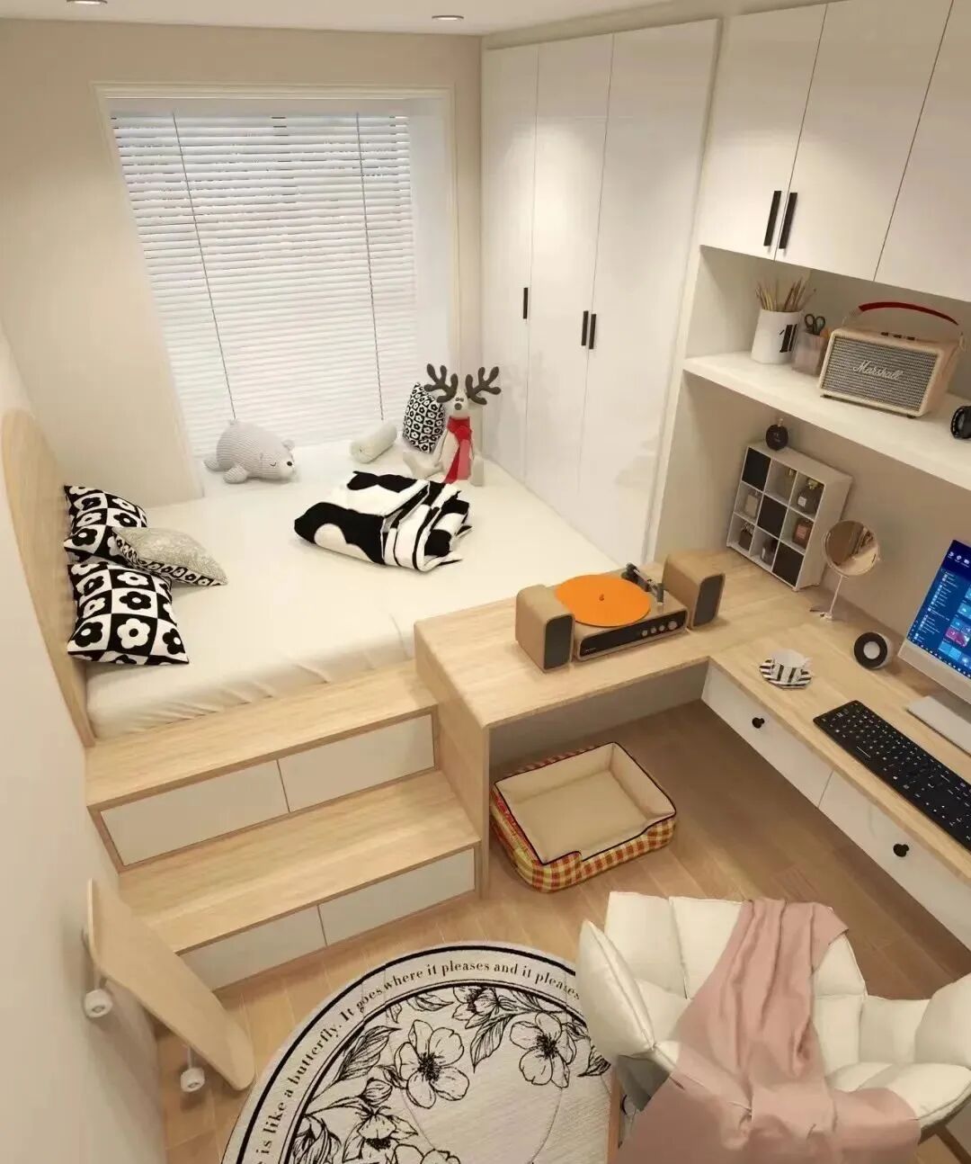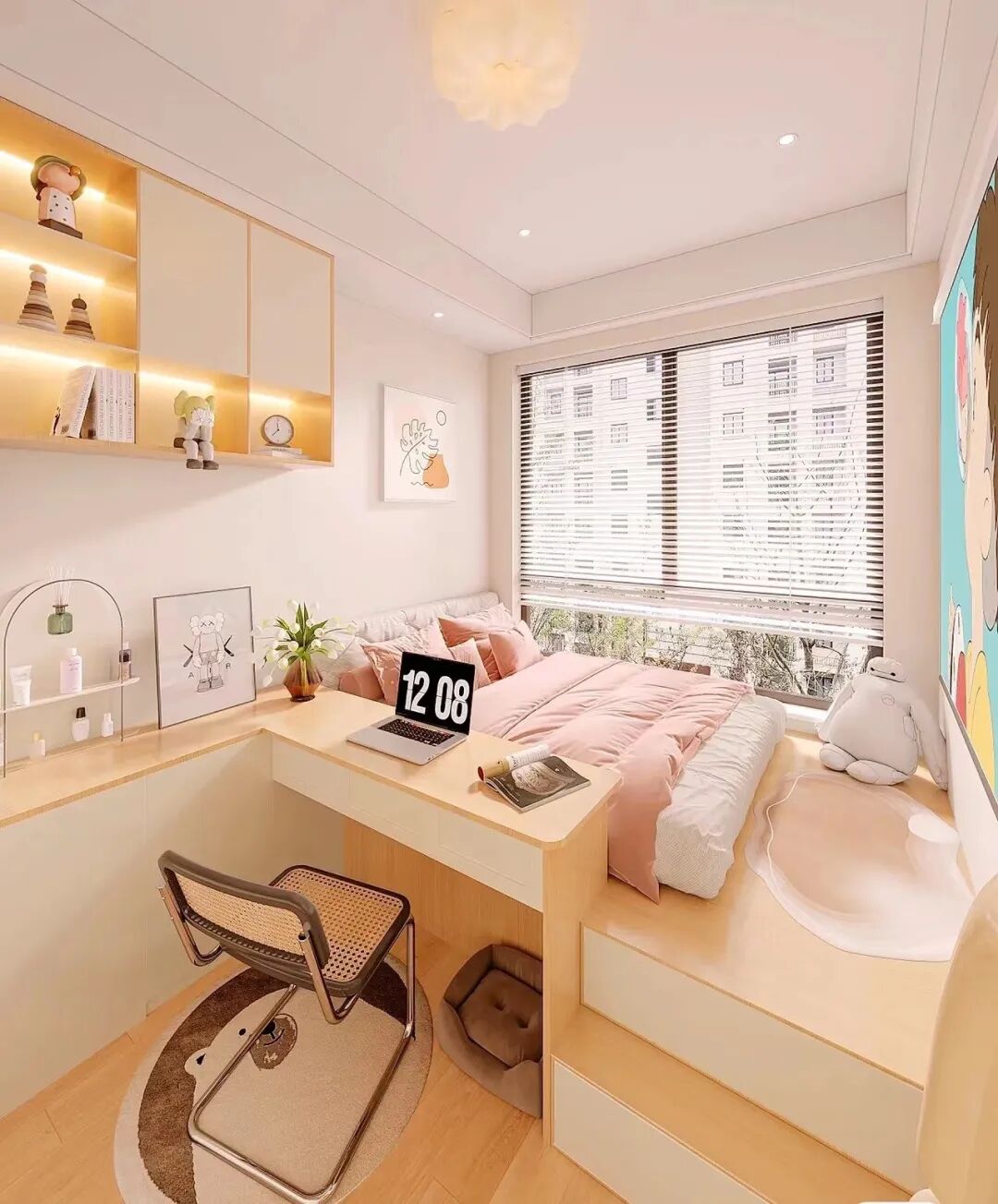 遇到小卧室,怎么设计实用又漂亮呢?今天给大家分享当下用户比较喜欢的卧室设计,结合榻榻米的设计形式与特点(虽然榻榻米受到的评价“毁誉参半”),但依旧阻挡不了我们的使用热情,就如隔壁邻居7㎡的小卧室,为了让孩子有个学习和舒适休息的空间,最终她选择了台阶榻榻米+L型转角书桌的设计方案,收纳、学习、休闲都解决了,去她家做客基本都会参观和向她“取经”。