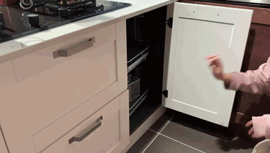 厨房地柜拐弯或者转角过深,拿取物品很不方面,转角拉篮和旋转柜完全可以改善。