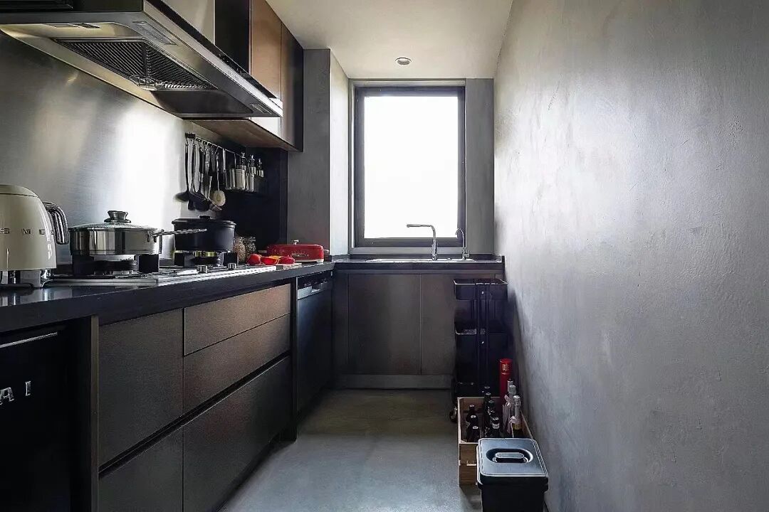 如果你家厨房是一字型布局,且足够宽约120cm,还想多出收纳空间,完全可以用窄柜来扩容,变成双11布局,即使窄,也很好用。
