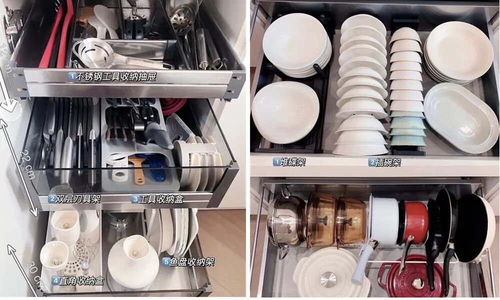 拉篮抽屉很好的能将家里的餐具做分类,但是需要自己利用一些碗架、刀架等工具做细分,更能装,也会好找东西。