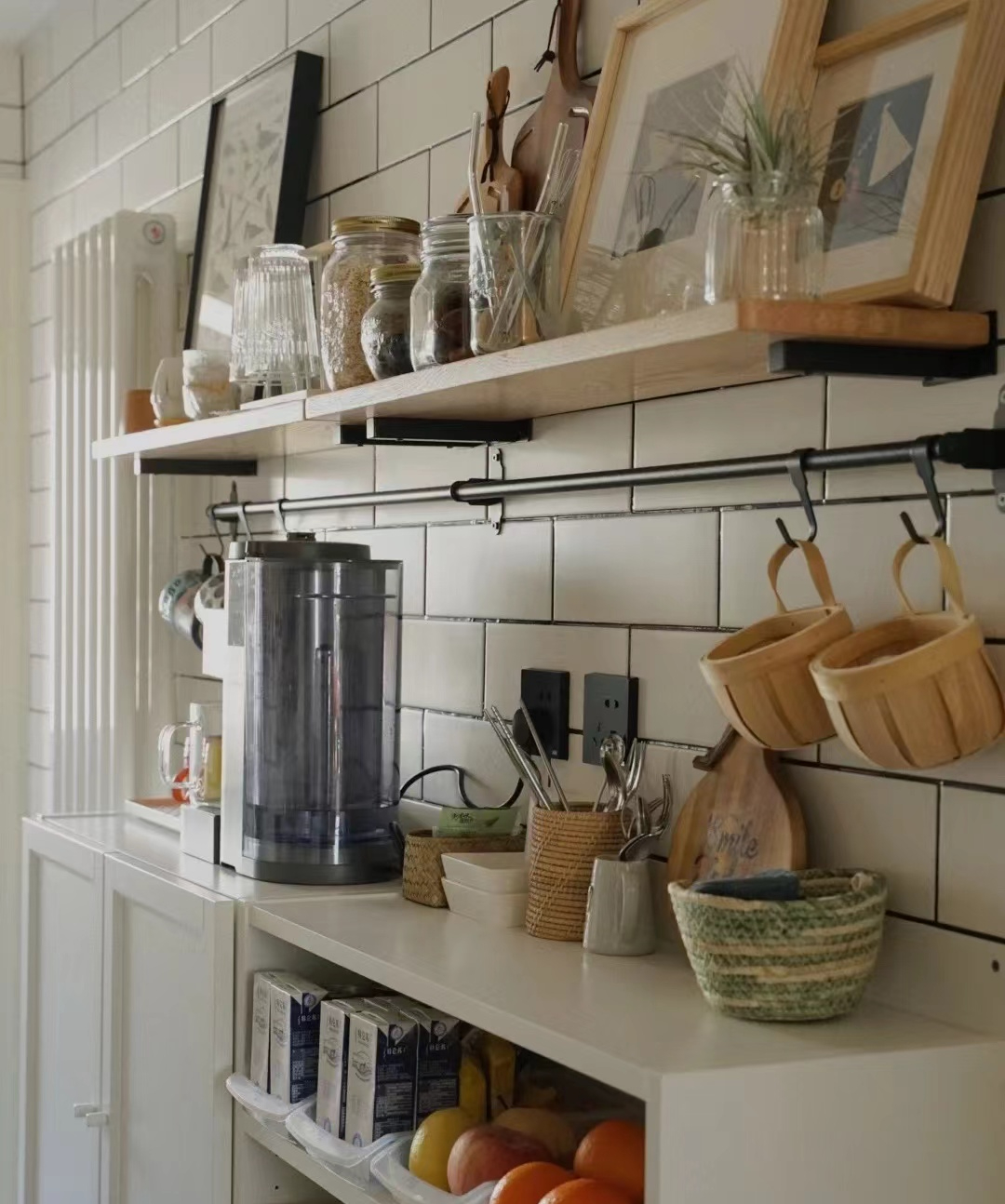 在安装橱柜前并未考虑好电器位置,后期可以根据空间灵活应对,比如在墙垛空余地方,做多层置物板,不到1㎡的墙面用活了。