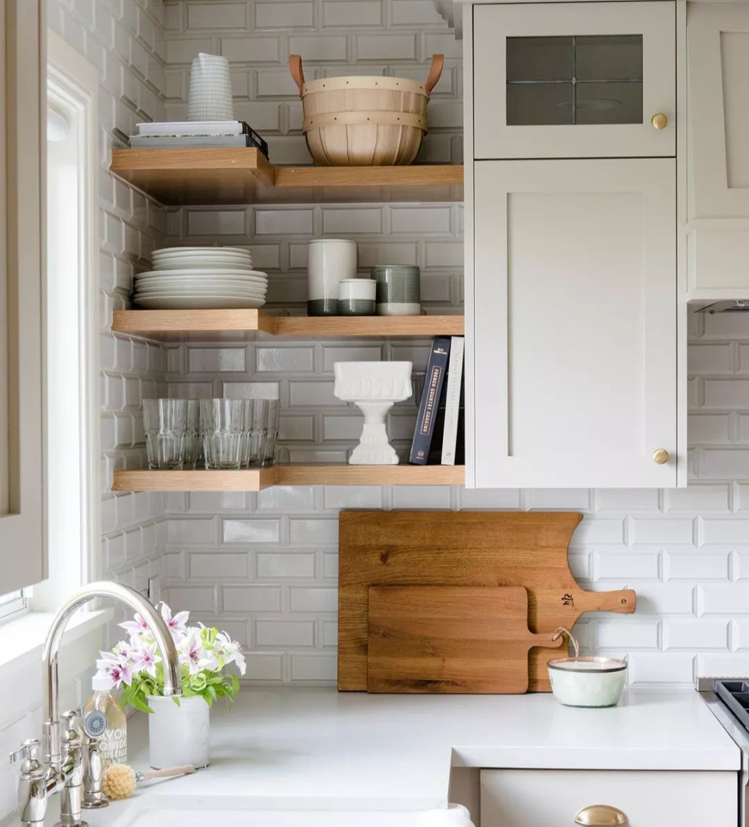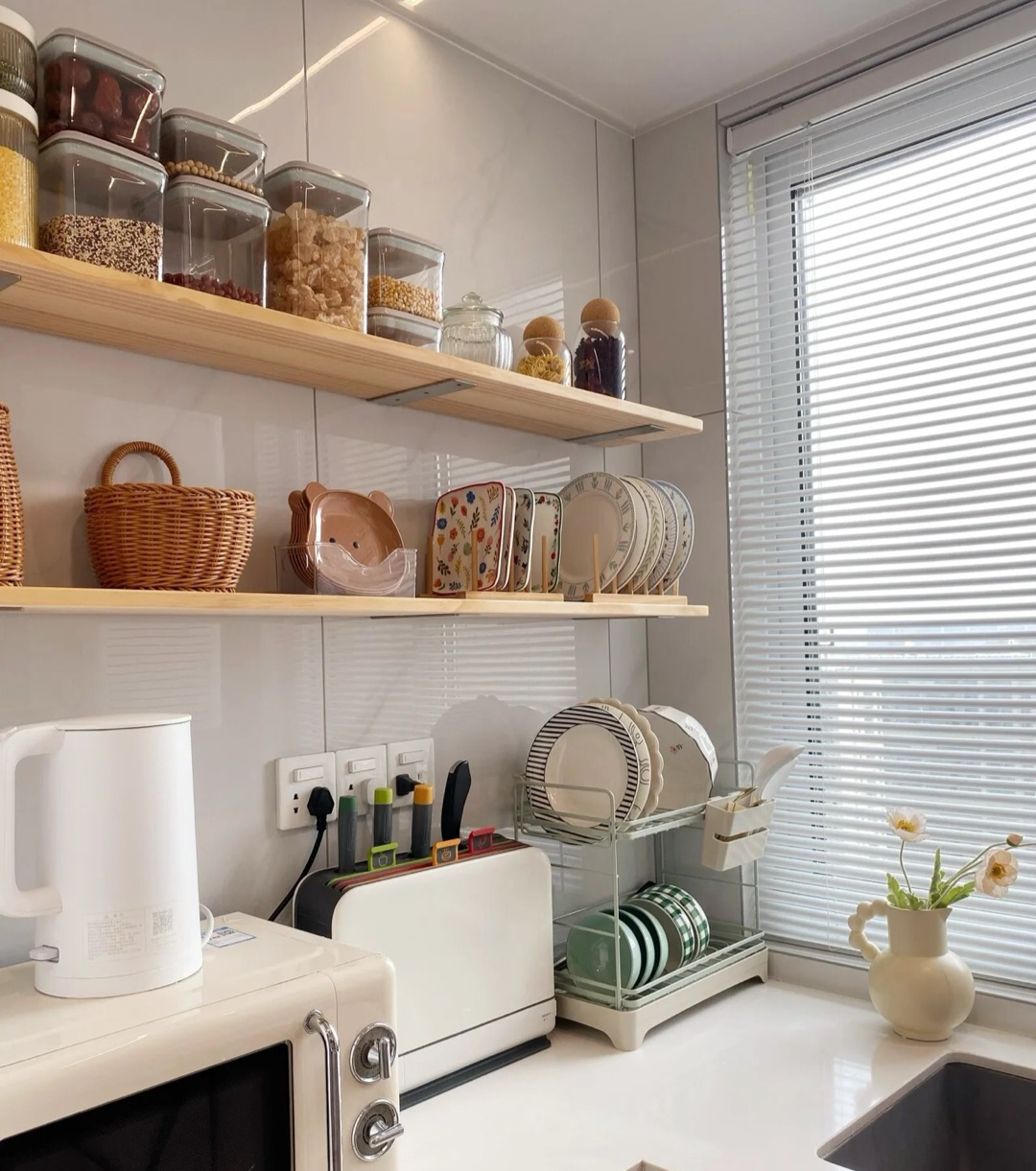 为了缓解台面太小的压力,多层隔板使用灵活,不浪费墙面空间,做在相应的区域做好分类收纳,大大解放了台面。