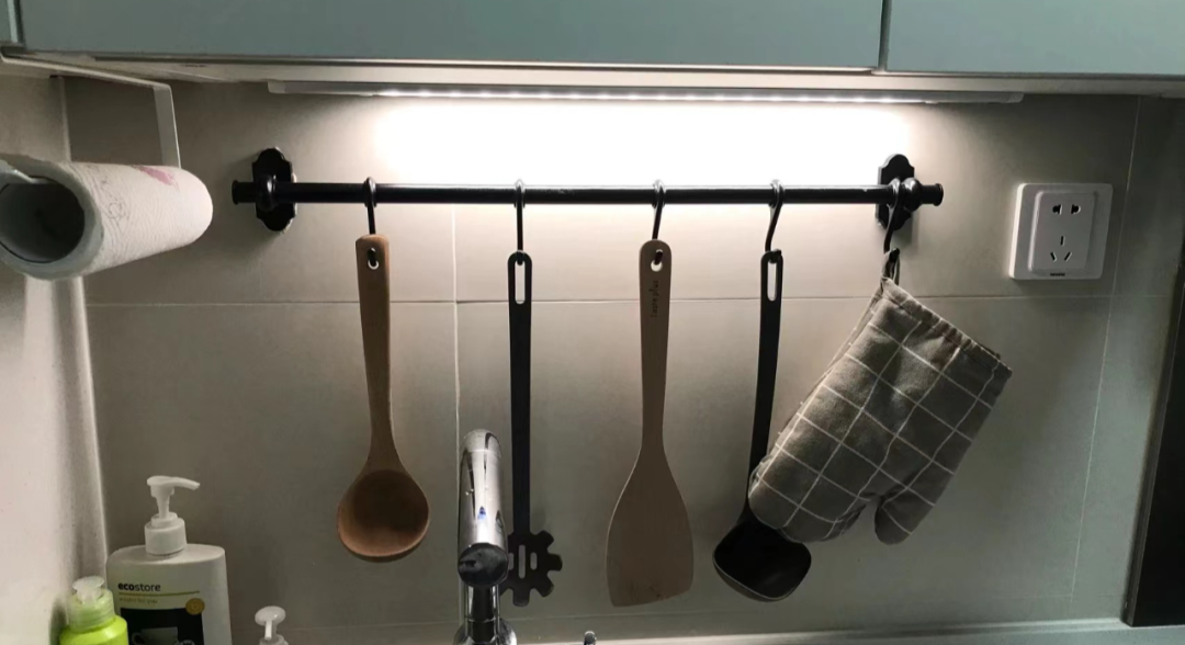比如在洗菜区的墙面安装挂杆来收纳洗碗巾、勺铲、刀架和小工具,超级能装,不凌乱。