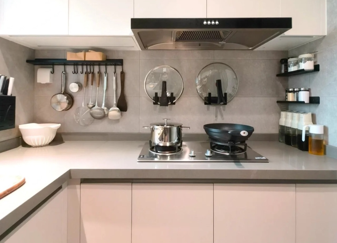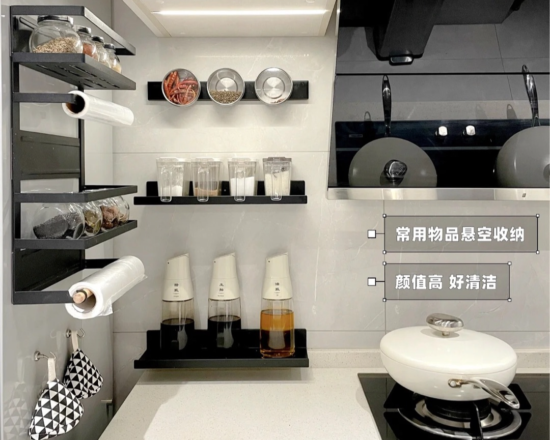 ④调料架、锅架:在烹饪区,最好是放置调料、锅架,抬手就能拿到,使用方便。