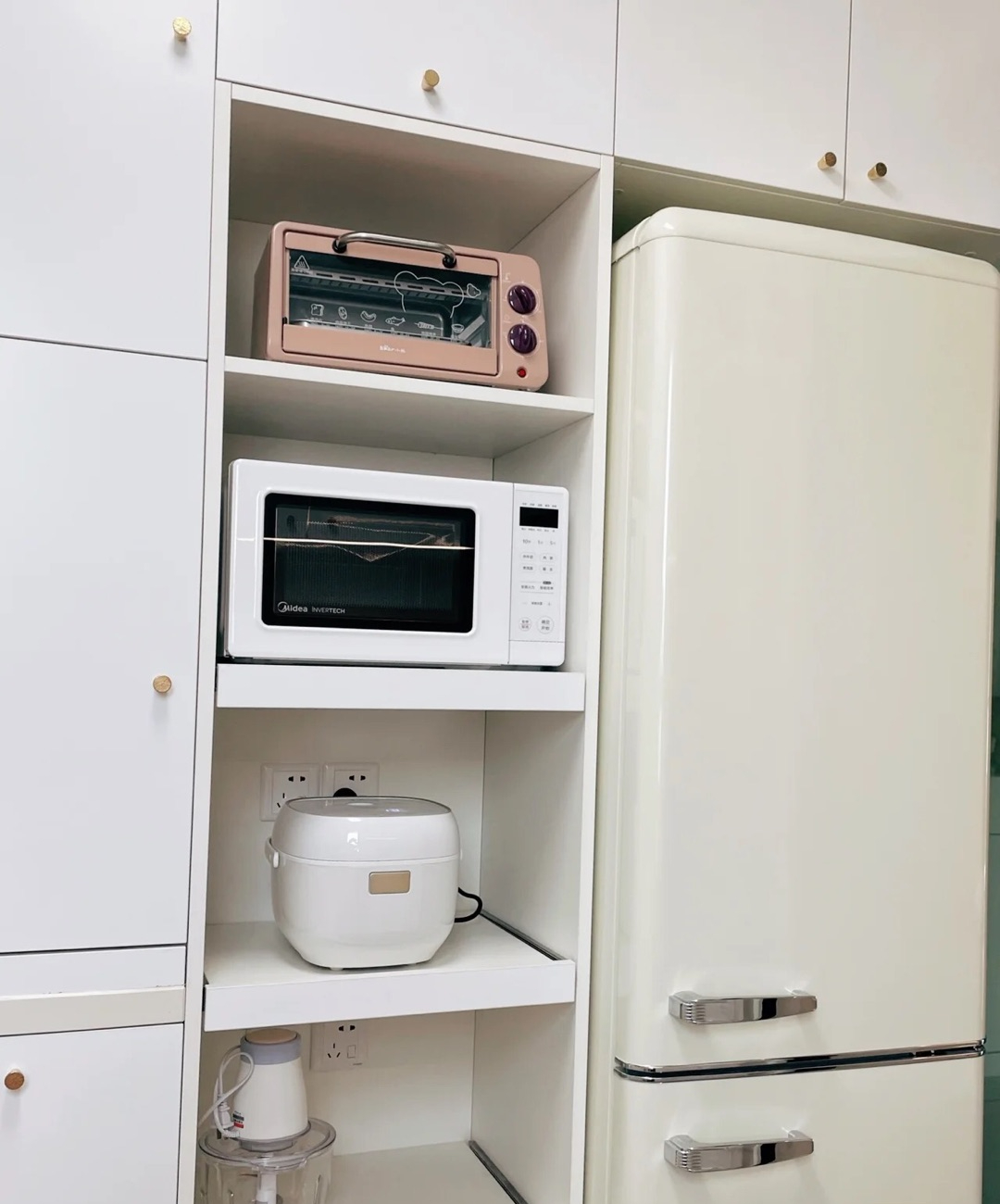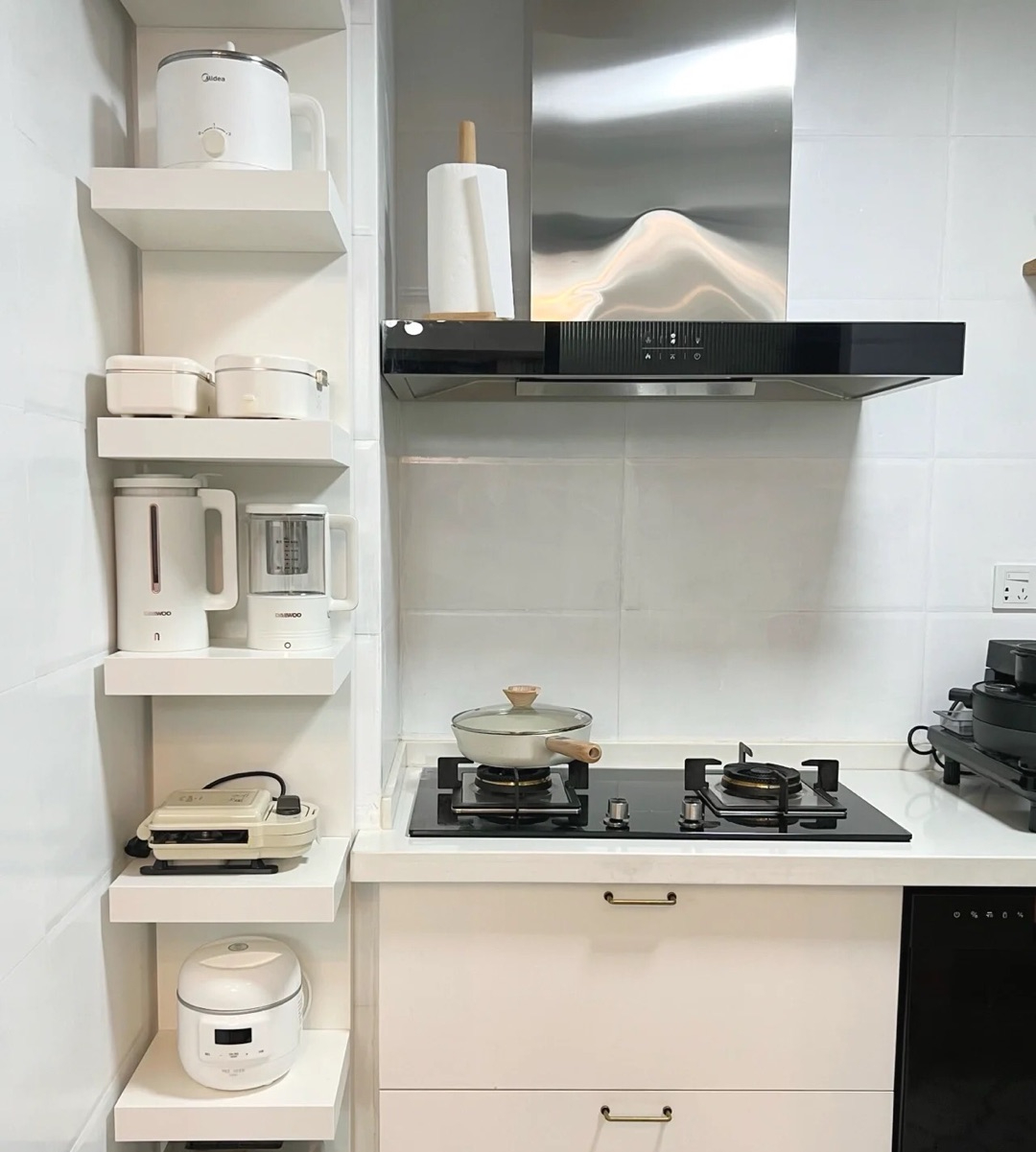 因为成本原因,有些家庭不做嵌入式设计,还可以做抽拉多层置物柜(架)来放置电器👇,务必预留好插座。
