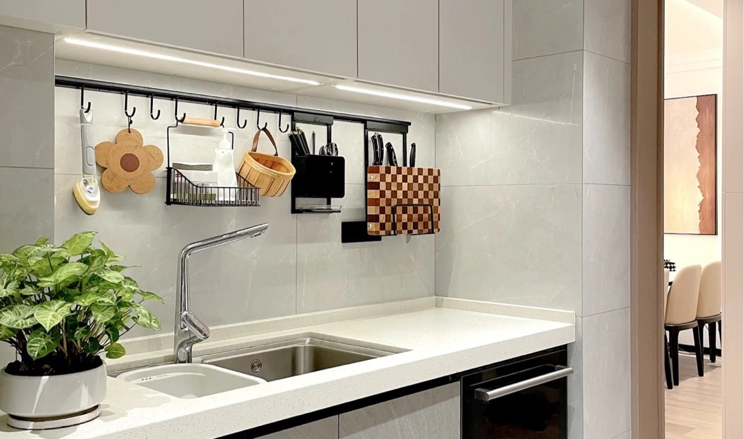 窄柜上空的收纳架、挂钩将收纳发挥到极致,如果在装修的时候完全没有考虑到日后生活使用需求,借助一些成品柜、多层收纳架等来实现U型,可以缓解收纳不足和台面小的问题。
