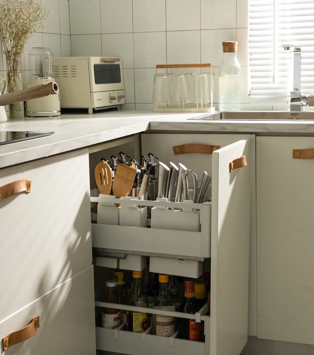 靠墙的转角柜,将原本的“闲置空间瞬间成为厨房的实用率最高的地方,拉篮、旋转篮绝对是此区域的神器,转角直接给扩容,收纳就是连转角都不放过!