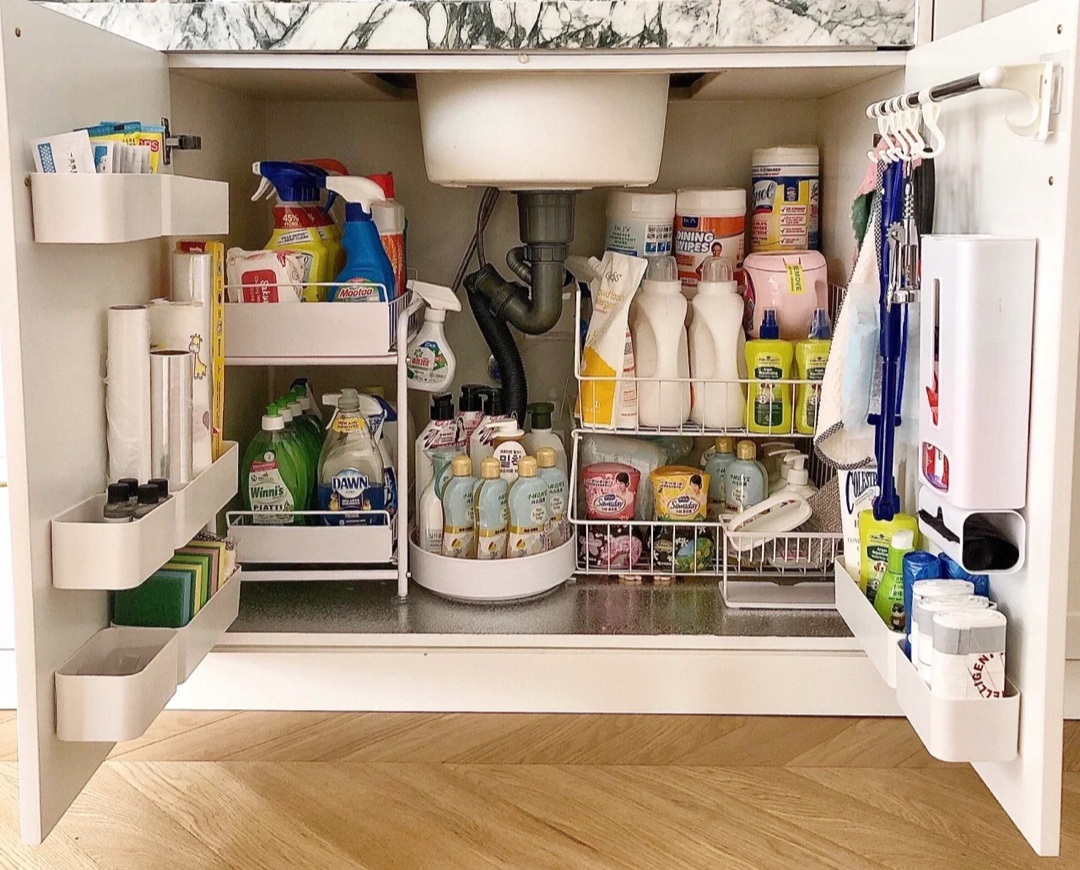 ①水槽区——双层收纳架+柜门收纳盒