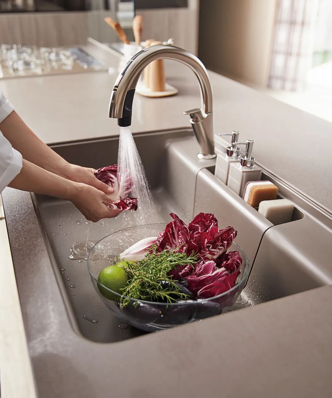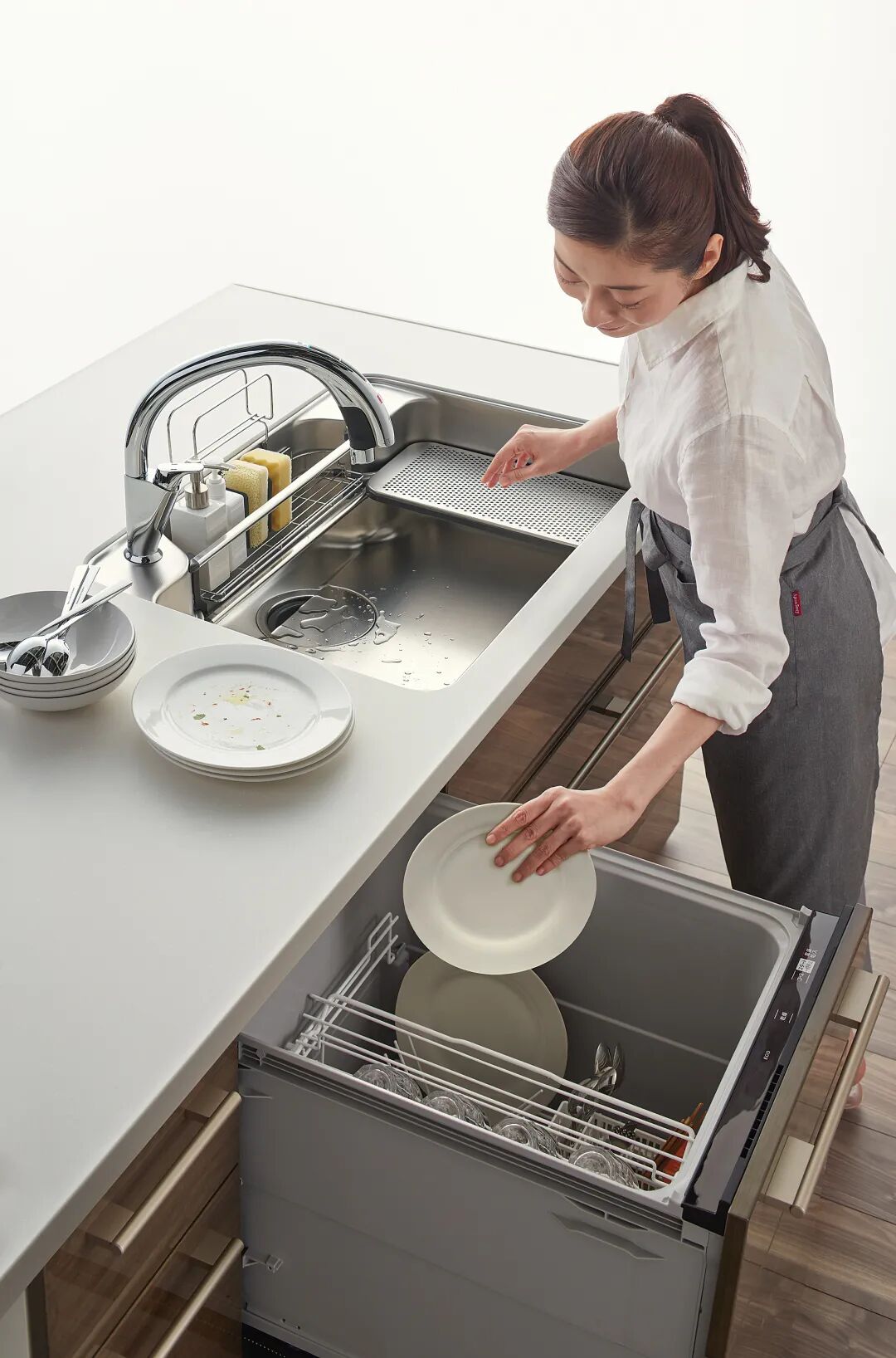 凹型水槽设计,让水龙头的落水点更靠近内侧,洗东西更方便,凹进去处还可以用来收纳洗碗棉等。