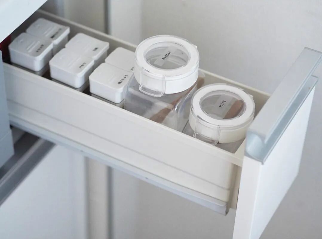 除了各种厨具、工具的收纳,调味品也是做饭必备,一些很小的调味品,日式橱柜会通过迷你深抽进行收纳。如果是大瓶的调味,也会使用拉篮进行存放,这点和国内是基本差不多的。
