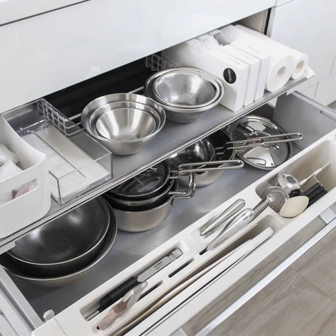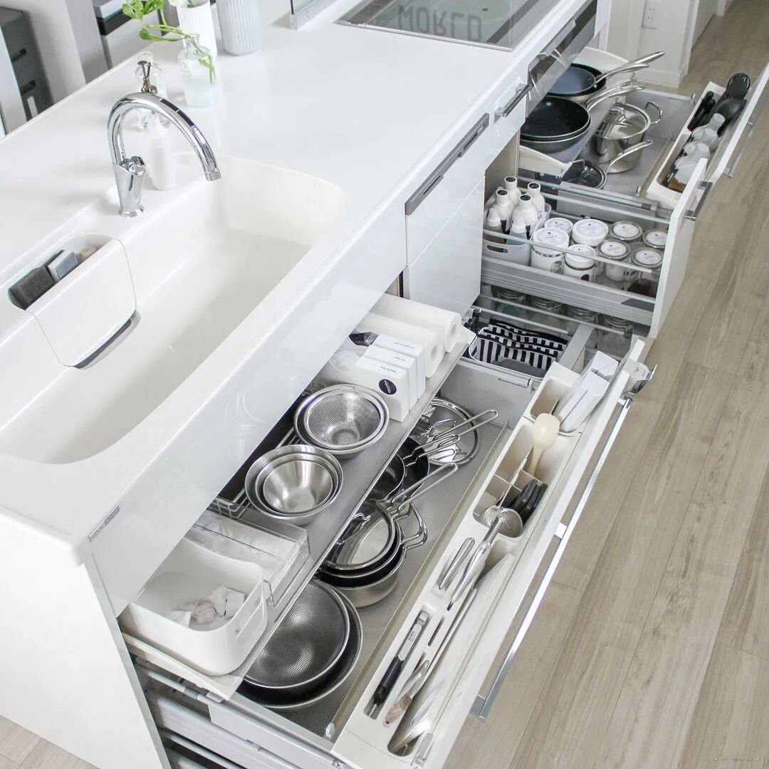 日式橱柜以抽屉为主,一是方便拿放;二是方便进行区分收纳。国内的设计师对于预算足够的客户,也会建议厨房多抽屉少柜体。但有一点,目前国内还没有做到,那就是“全开抽屉”。