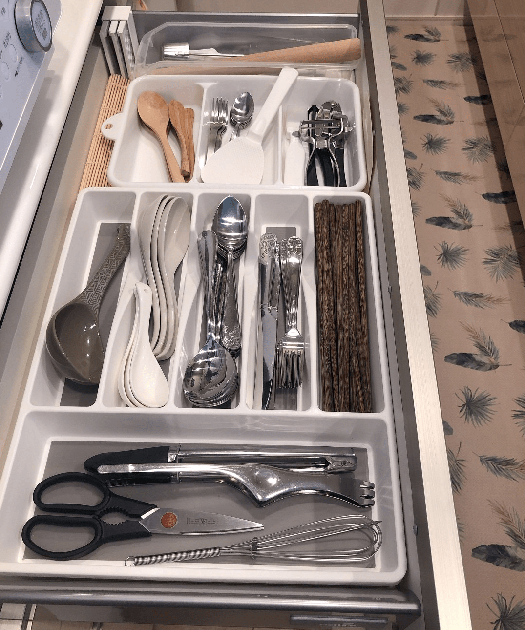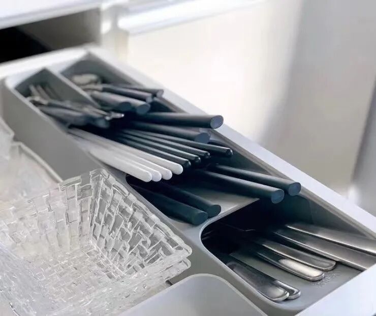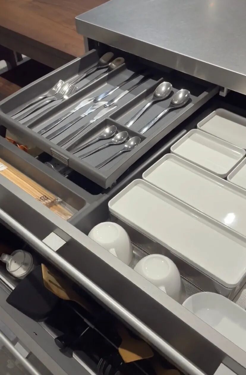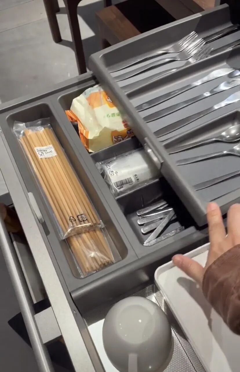 分隔收纳餐具的抽屉,大多都是出厂就设计好的,如哪些位置收纳什么餐具,用于多大的抽屉内等。即便抽屉很多,打开也全都一目了然,增加了拿取的便捷。