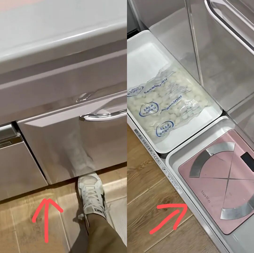 不过他们将抽屉表面拉手,换成内部的反弹器,这样脚踢一下,抽屉就能自动打开。同样通过脚踢或推的方式,让抽屉关闭。