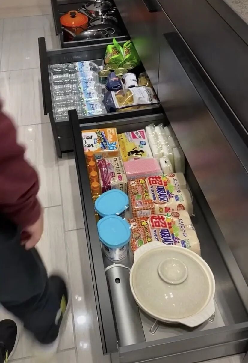 前几天和大家分享过日式的踢脚抽,它位于橱柜的最底部,按照国内的家装,基本都是直接用板材密封起来。日式橱柜将这个位置也设计成了薄抽形式。