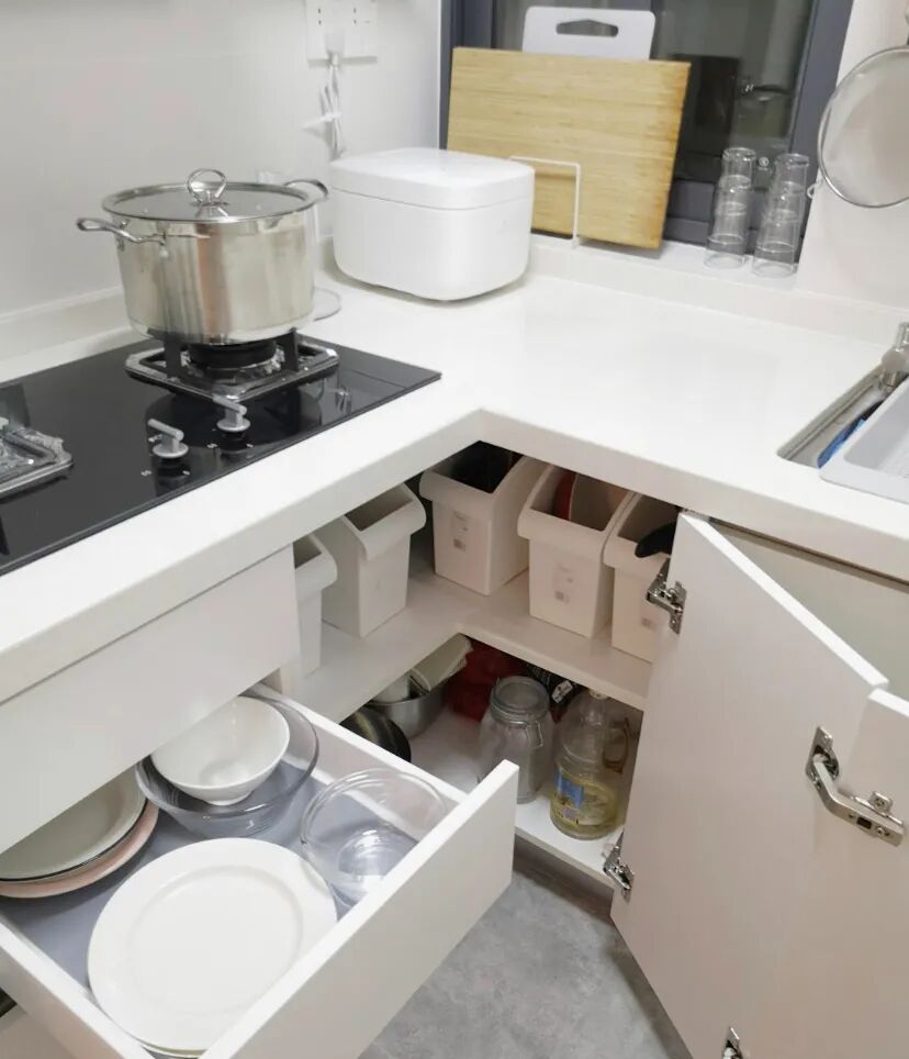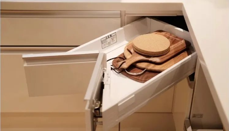 日本橱柜直接将拐角柜体改成三层抽屉,每个抽屉做成双拉门,就解决了拐角的打开难度问题。相对橱柜来说,拿取更方便,拉出推入都轻轻松松,价格上也不会很高。
