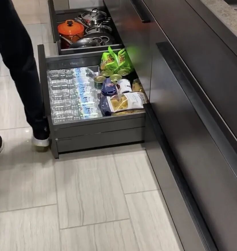 薄抽内可以用来收纳饮料啤酒、零食干货、厨房的扁平化的锅具、工具等,容量相当大。对于小户型厨房来说,一个抽屉储物几乎相当于一个小橱柜了。