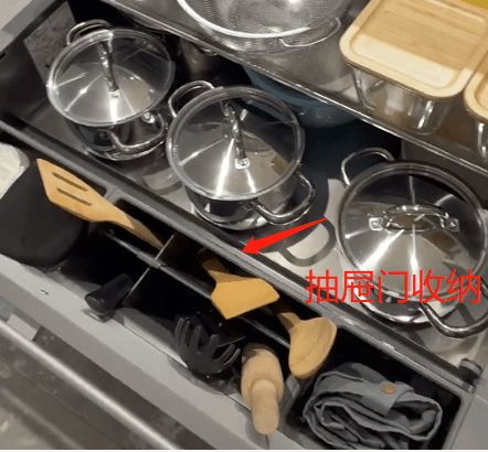 前面我们提到全开抽屉,120度的打开方式,也正因为这种方式,让抽屉门有一定的活动空间,所以一般会设计成厨房工具的收纳位。