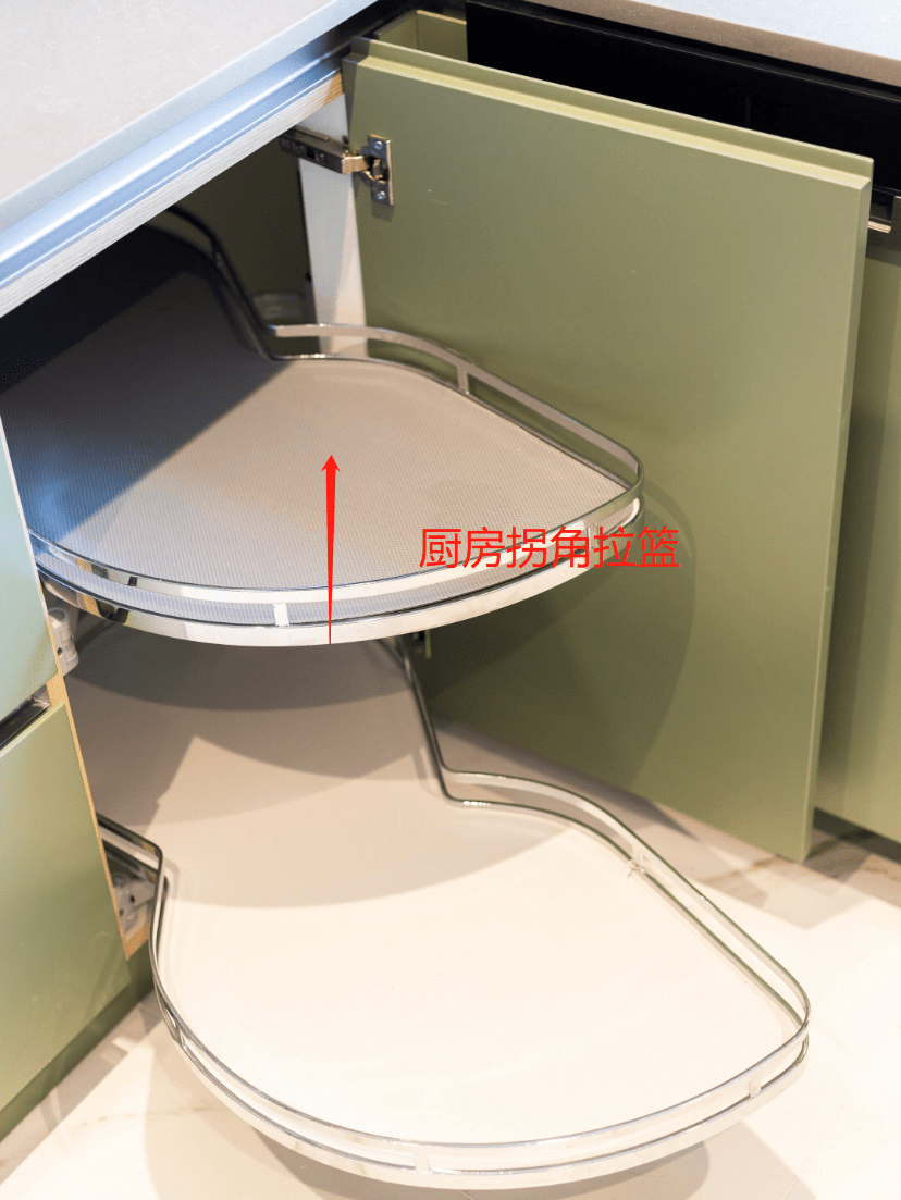 另一种做法是前些年“风很大”的拐角拉篮,虽然拿取上可以完全抽出,但是价格高,安装麻烦,还很占空间。一旦坏了,空间就白费了,而且放上各种锅具后,每次抽出来并不省力。