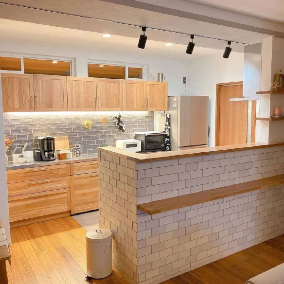 利用高度差,往外搭配15-20cm宽的桌面,马上变身变身茶吧、水吧、咖啡吧,还可以做轻食区,吃个情调早餐。
