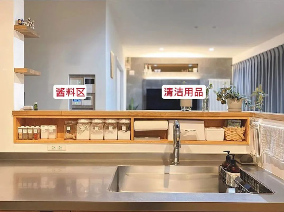 怕溅水可以将收纳区略微缩小一点,放在备料区的前方~靠近炉灶区域可以放置酱料瓶罐,炒菜时顺手就能拿到盐、糖。