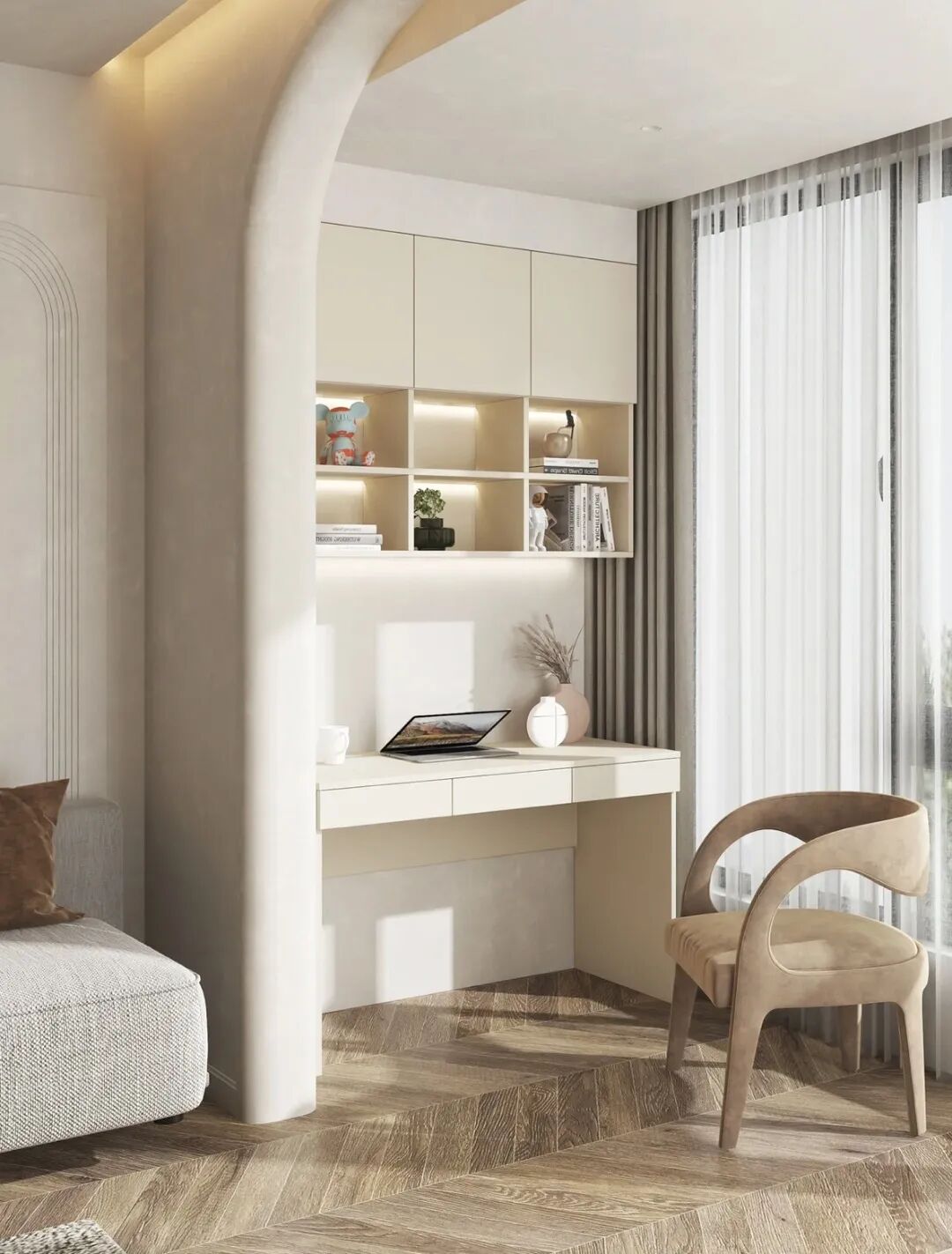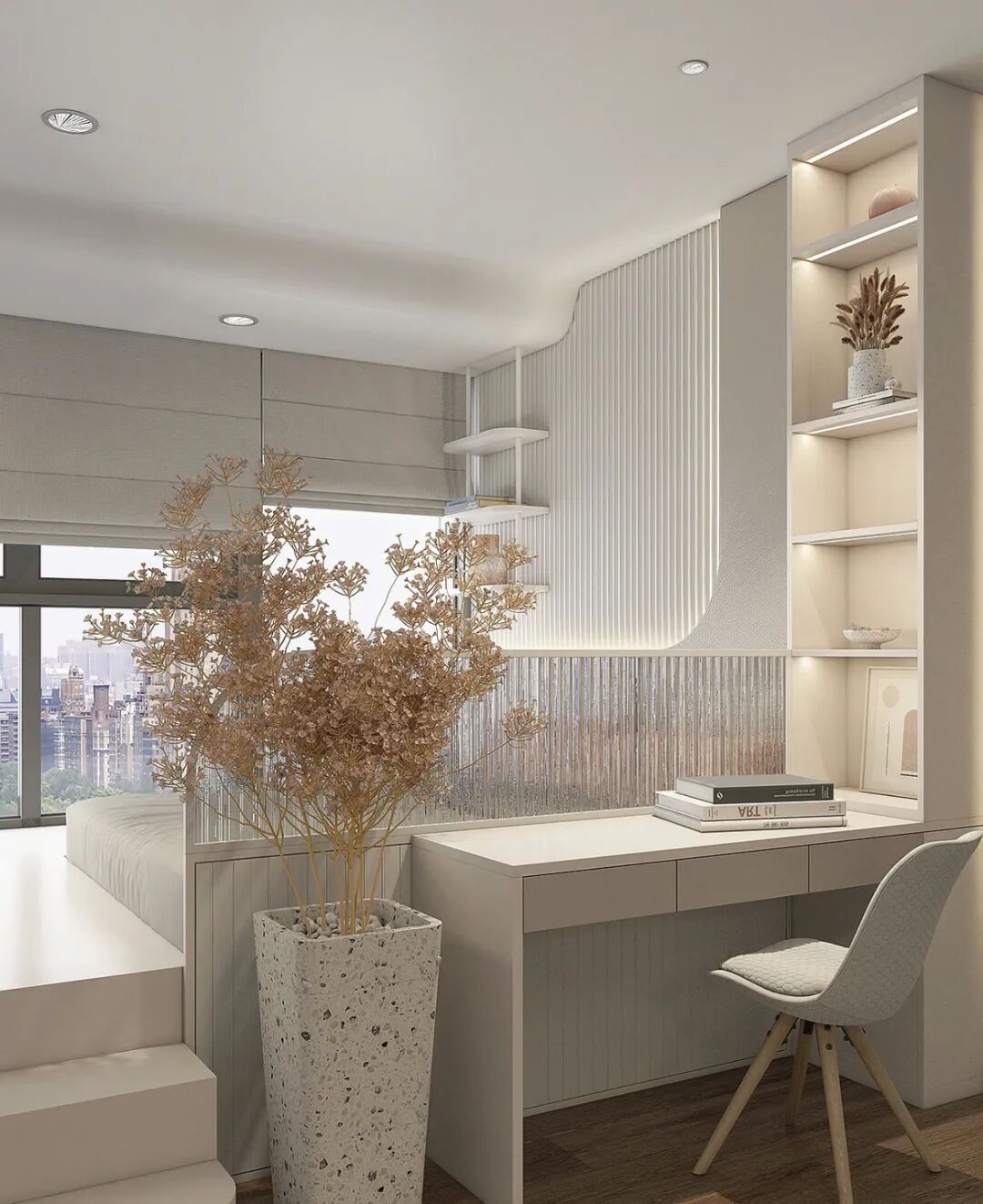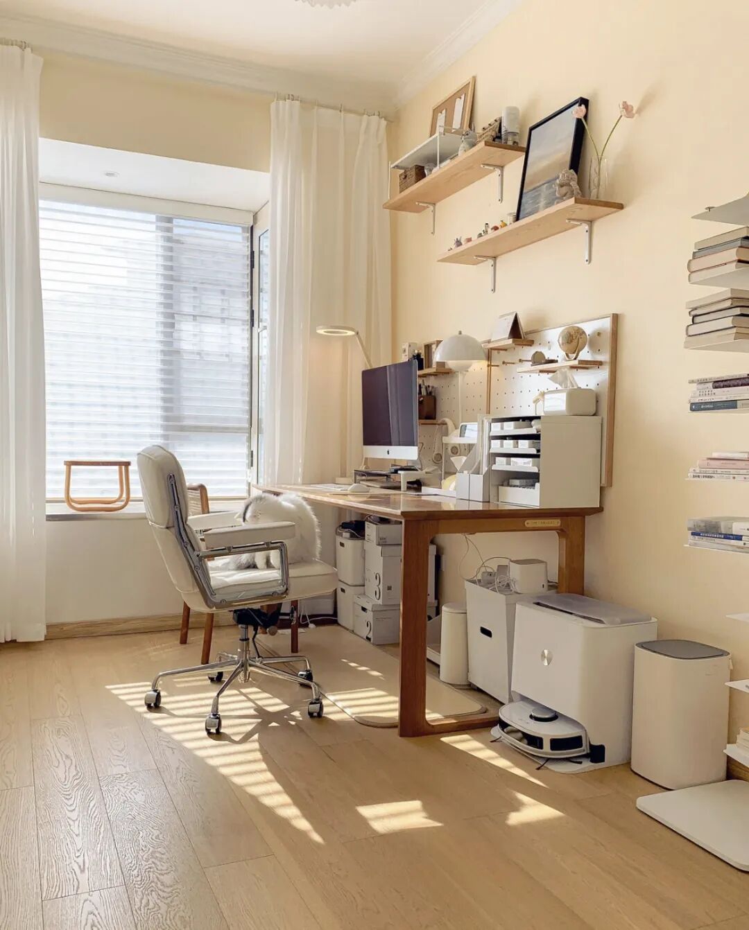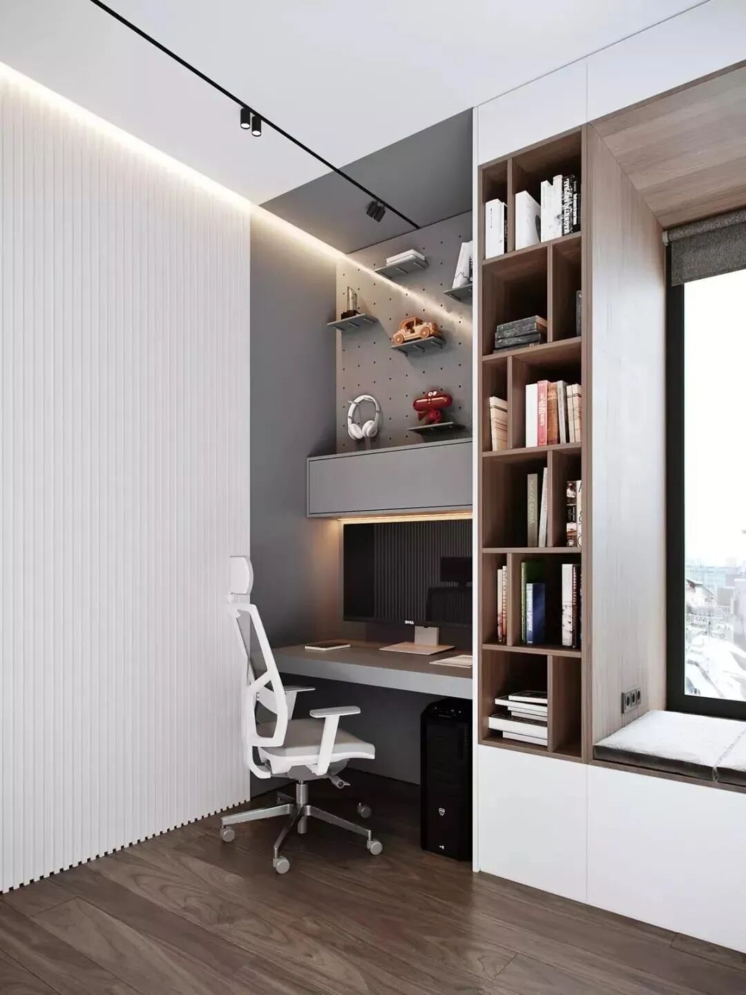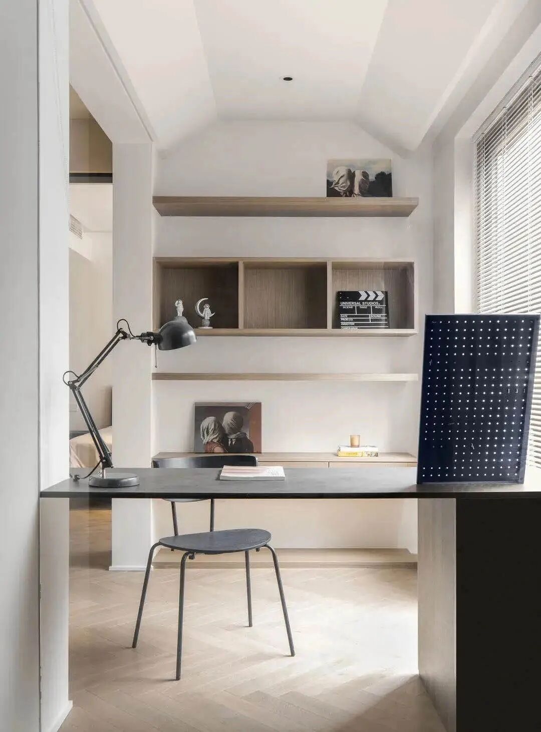 千万不要浪费窗边区域,窗边可以说是阅读、办公的绝佳之地,视野开阔、空气清新,采光、通风都无敌棒!完美利用空间同时,通过简洁实用的设计,带来舒适而又静谧的工作环境。