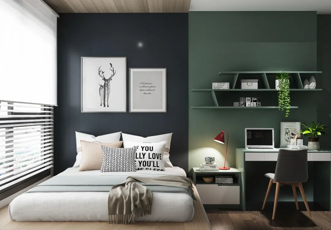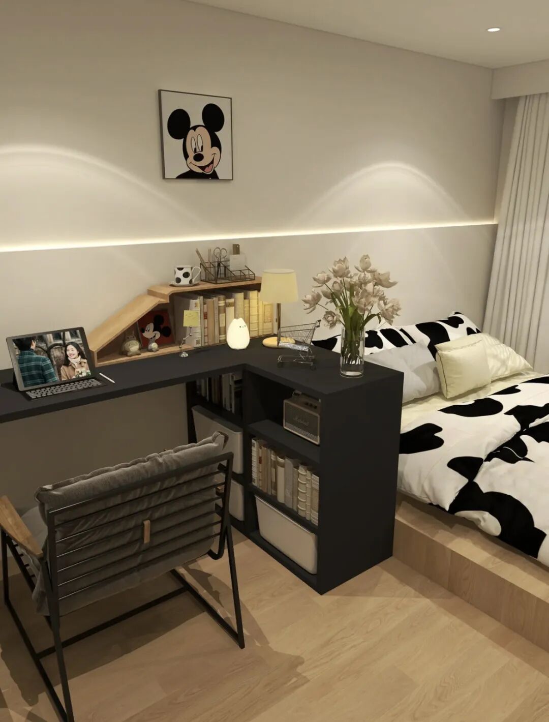 如果想要整体性更强一些,可以选择地台床+书桌,解决了小户型的空间问题,又进行了分区,个性化设计让空间更加便捷。