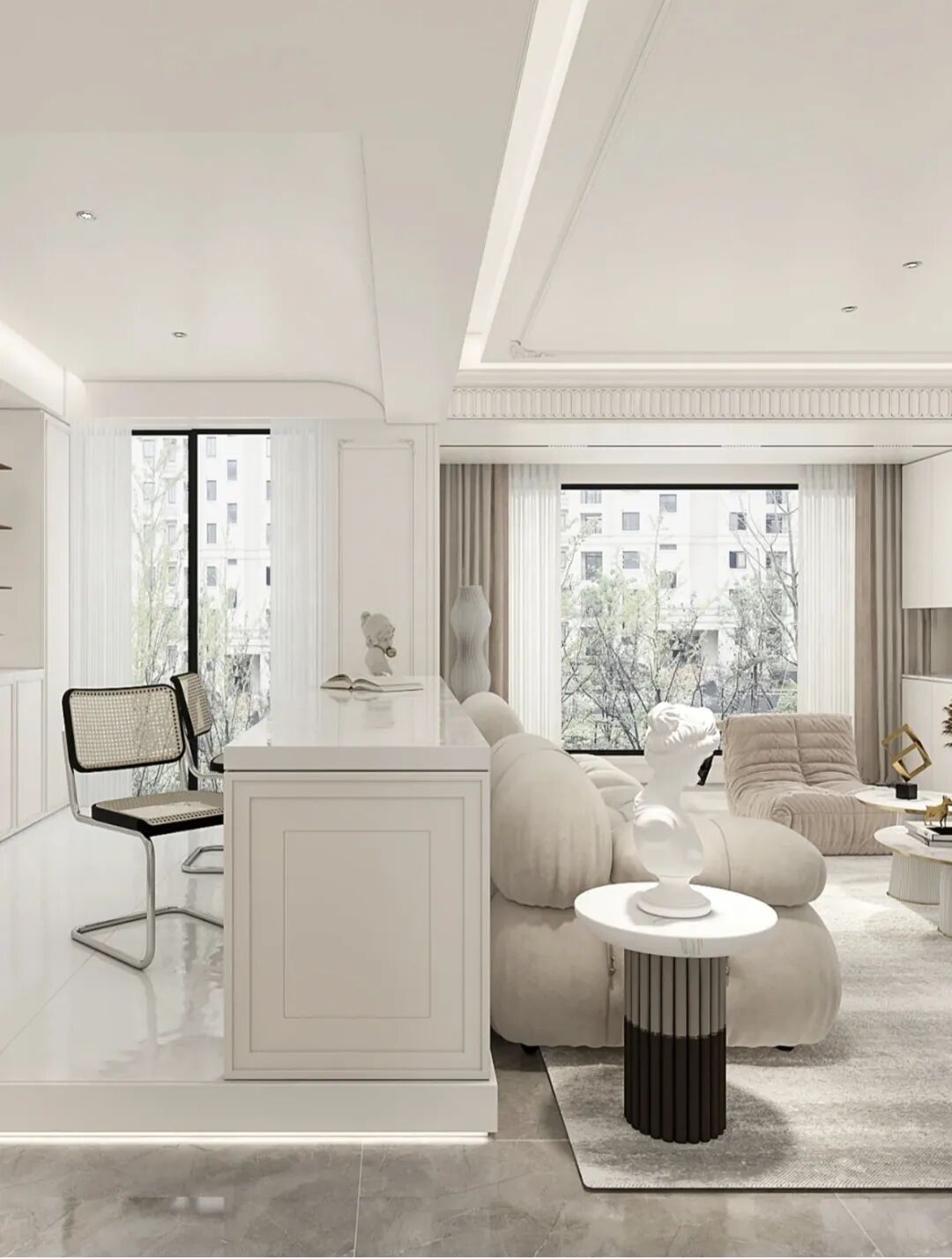对于可餐厅一体的空间则更加锦上添花,直接在沙发后面进行长桌设计,既能够达到视觉隔断的效果,将客厅餐厨合理划分,又能够形成多功能区域,办公、用餐两不误。
