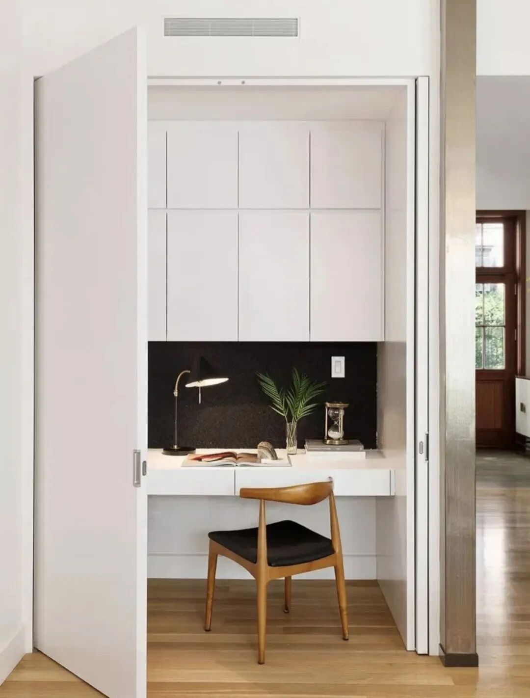这种壁橱内隐藏的形式很适合无书房,又希望拥有独立办公、阅读区的小户型。以普通壁橱的宽窄进行打造,打开就是一个办公区,还能够有储物的作用。关上又能够完美隐藏,不管如何杂乱(还是要收拾的哈),都能够一下子回归到空间一体感。