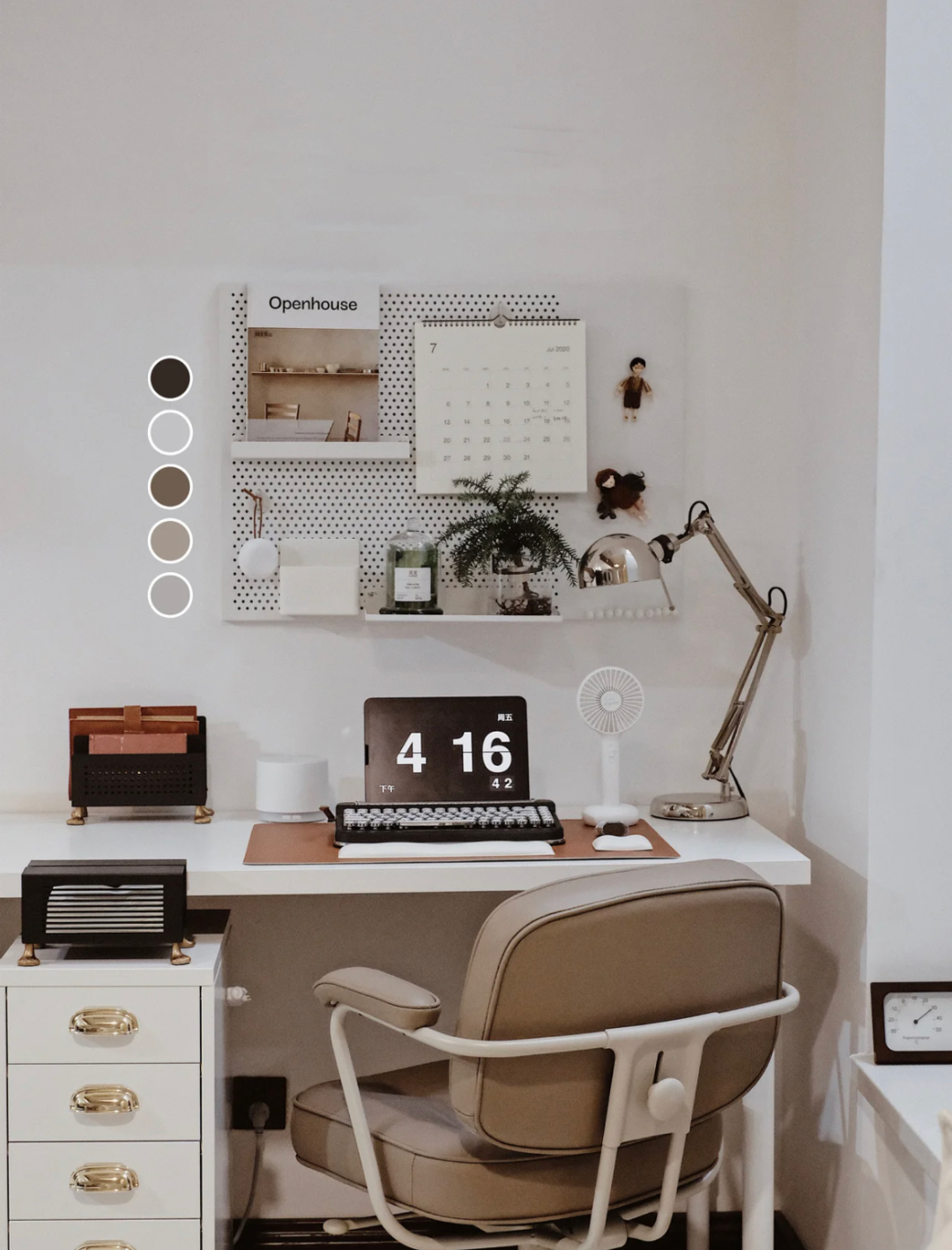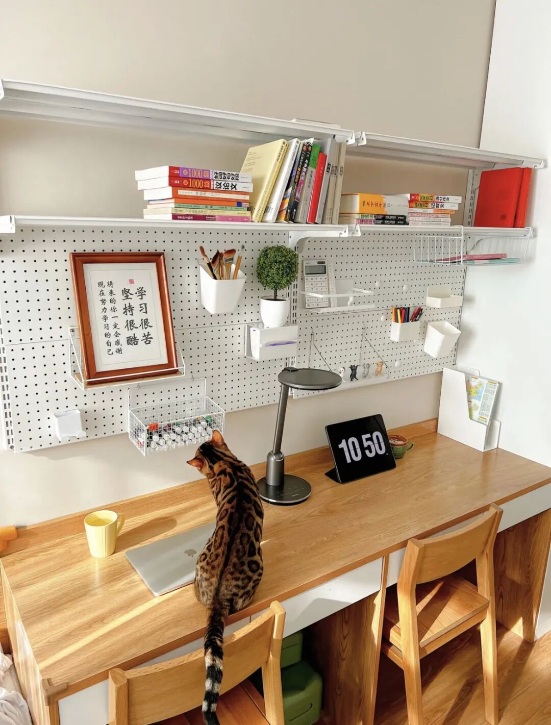 想让桌面整洁起来,也可以选择价格便宜且安装简单的洞洞板,洞洞板有多种颜色、样式可选,可以根据自己实际情况安排布局。