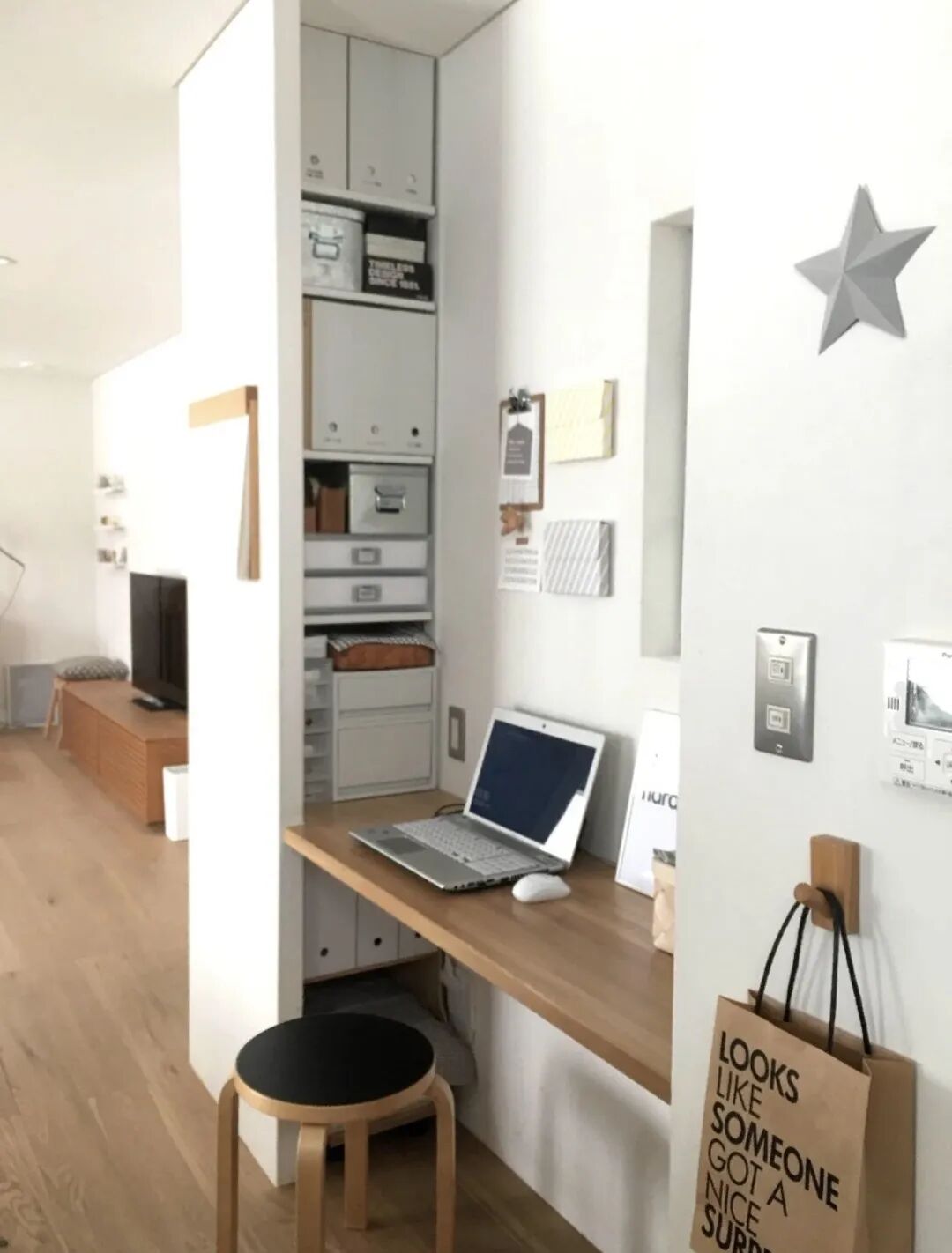 与其他空间一样,书房、办公区的收纳空间也必不可少。但对于小户型来说挤出这1㎡已经是使出全力了,再想收纳只能纵向在墙上下功夫了。