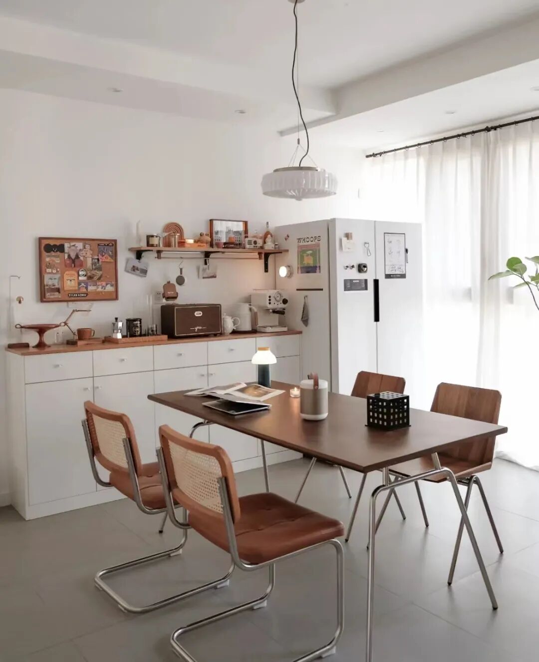 如果家里实在无法开辟出一个专门的位置留给办公和读书,不用愁,还有个地方可以身兼此职。餐桌除了用餐,还可以兼做书桌,如果条件允许旁边再来一个书架,拿取都很方便。
