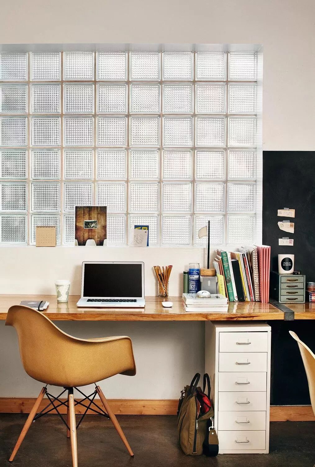 把书房的窗洞改成玻璃砖,柔和的光线适合阅读,工作的时候心情也轻松了不少。空心玻璃砖中间的密闭腔体,还能让书房的工作环境更加安静。