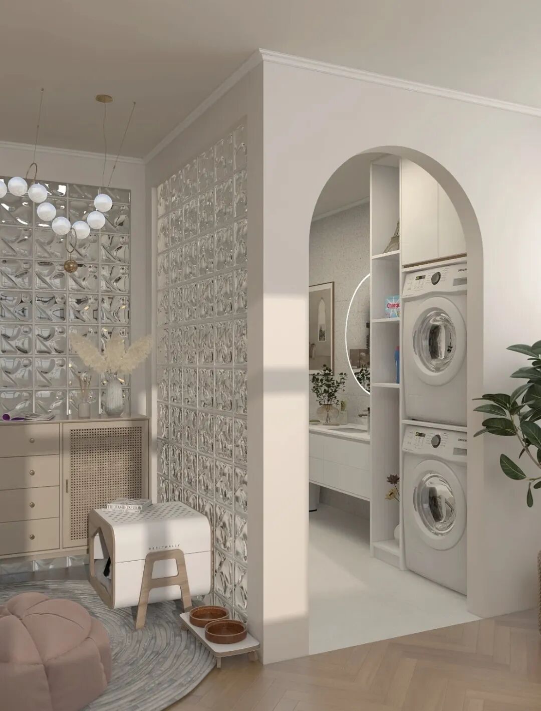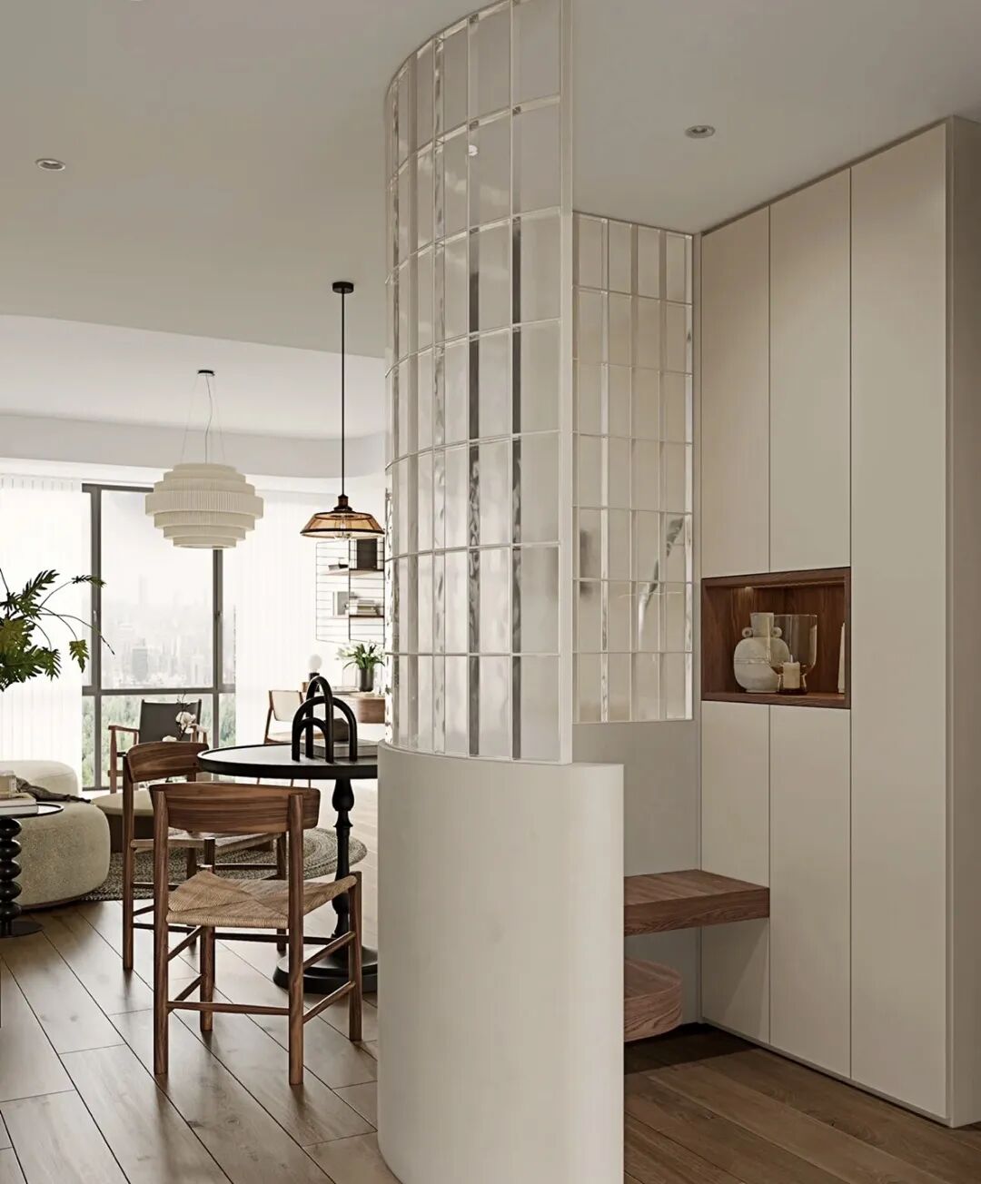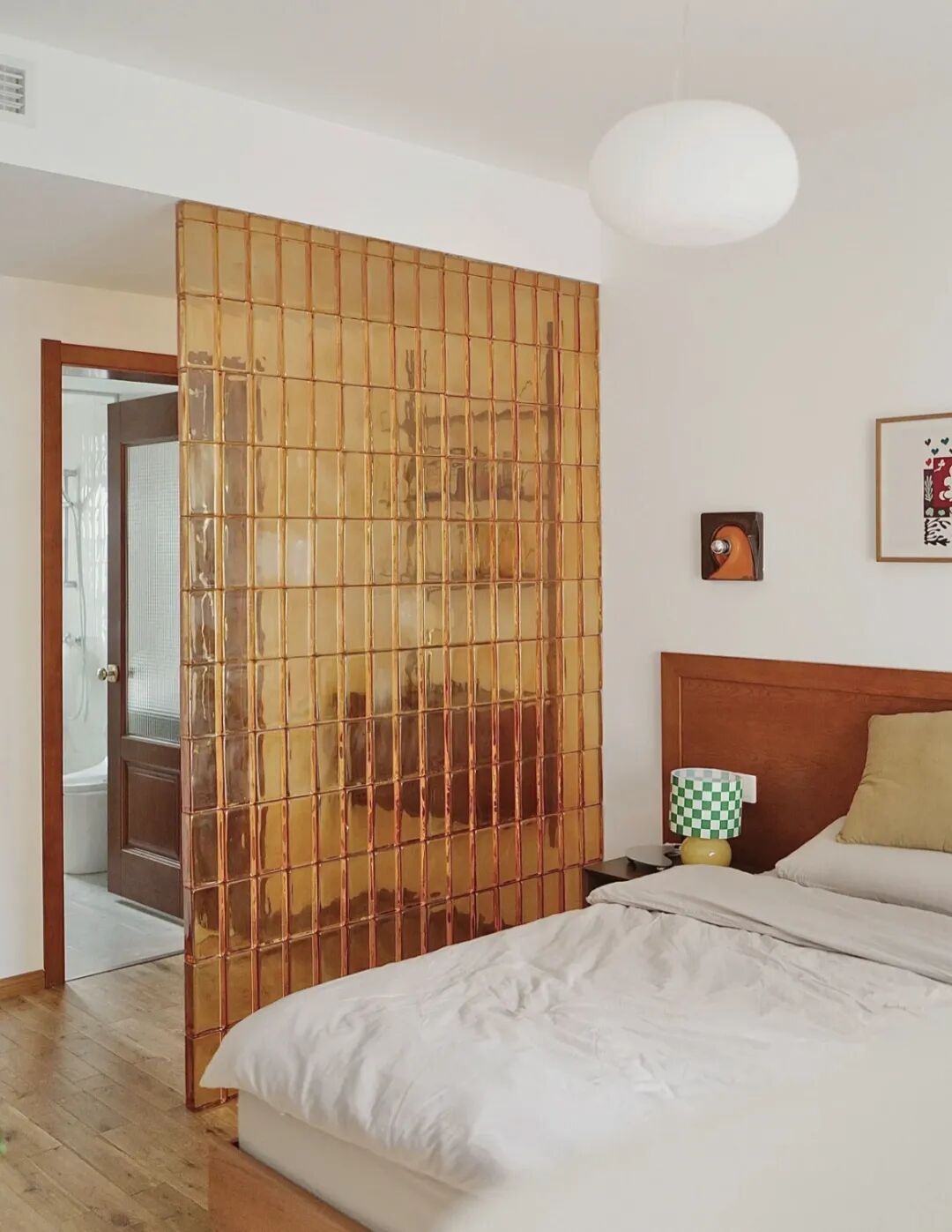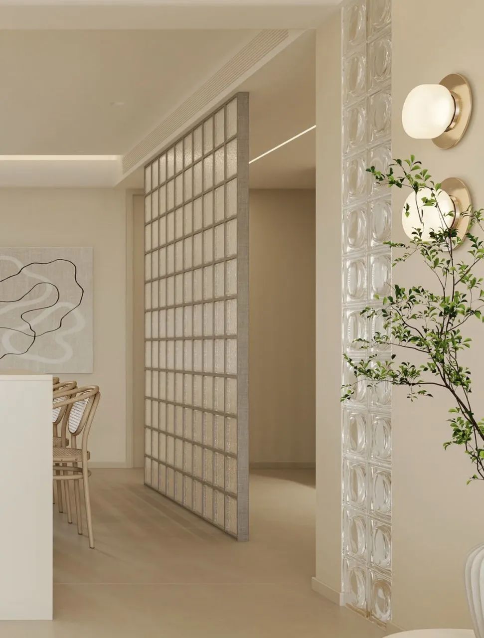 用透明玻璃砖作为半隔断,即可以让照进来刺眼反光的阳光变得柔和舒适,又可以让墙面有了新的通透感,不会让空间过于割裂。