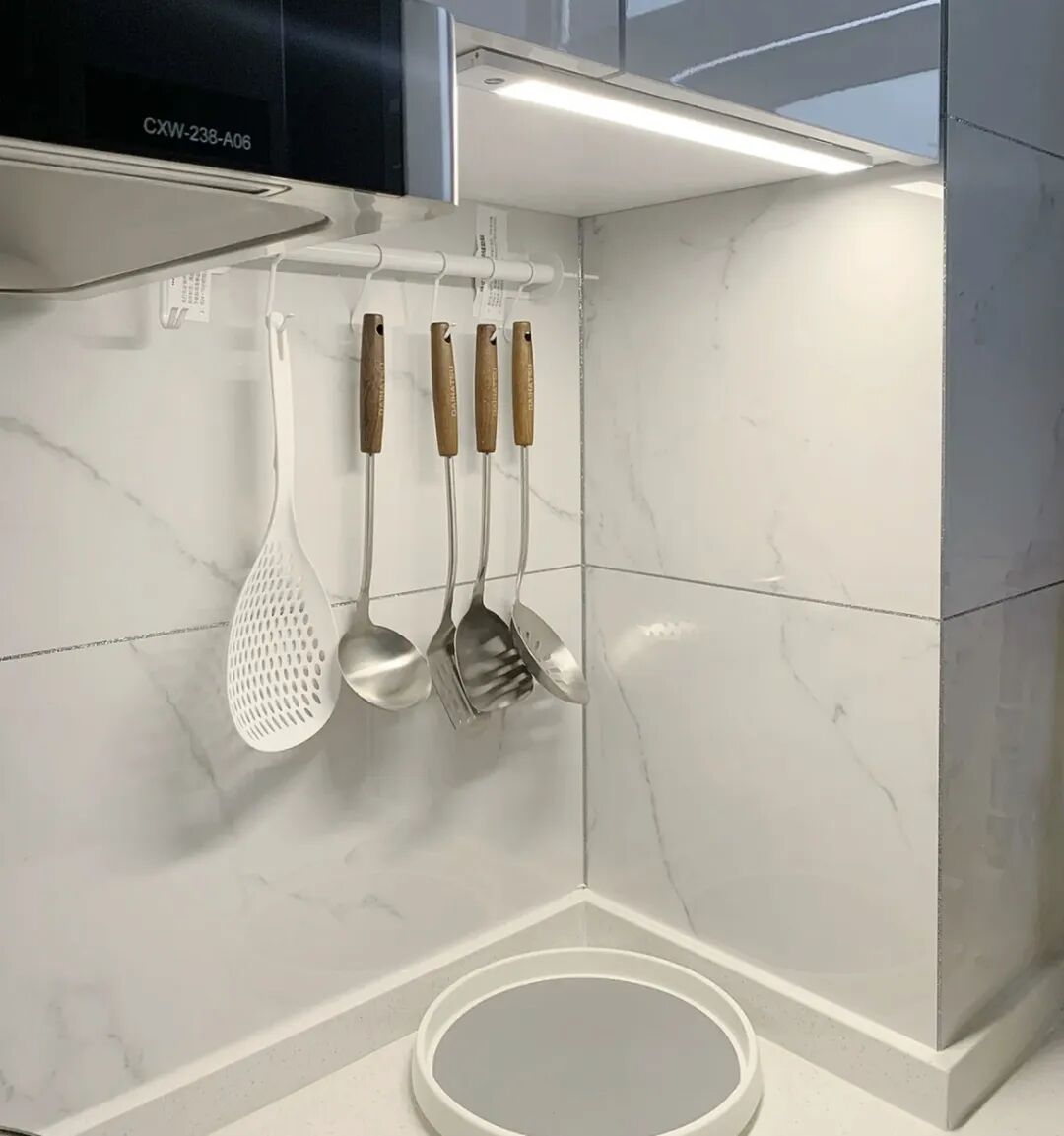 跟玄关处波纹灯不同的是,这个是手扫的,就是做饭时,手在灯下挥一下,就自动亮了,用完后,再挥一次,自动就灭了,不是那种人体感应的,更符合做饭的场景。